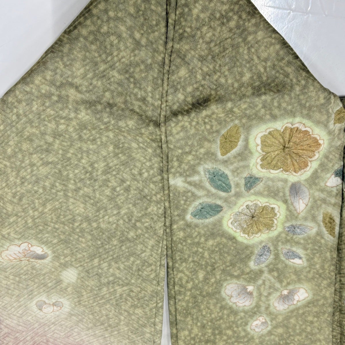 訪問着 身丈168cm 裄丈68.5cm L 袷 雪輪 草花 金糸 金彩 茶緑色 正絹 名品