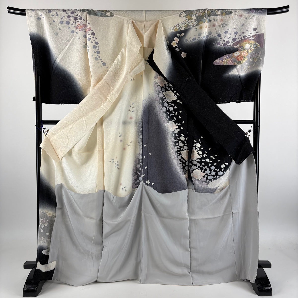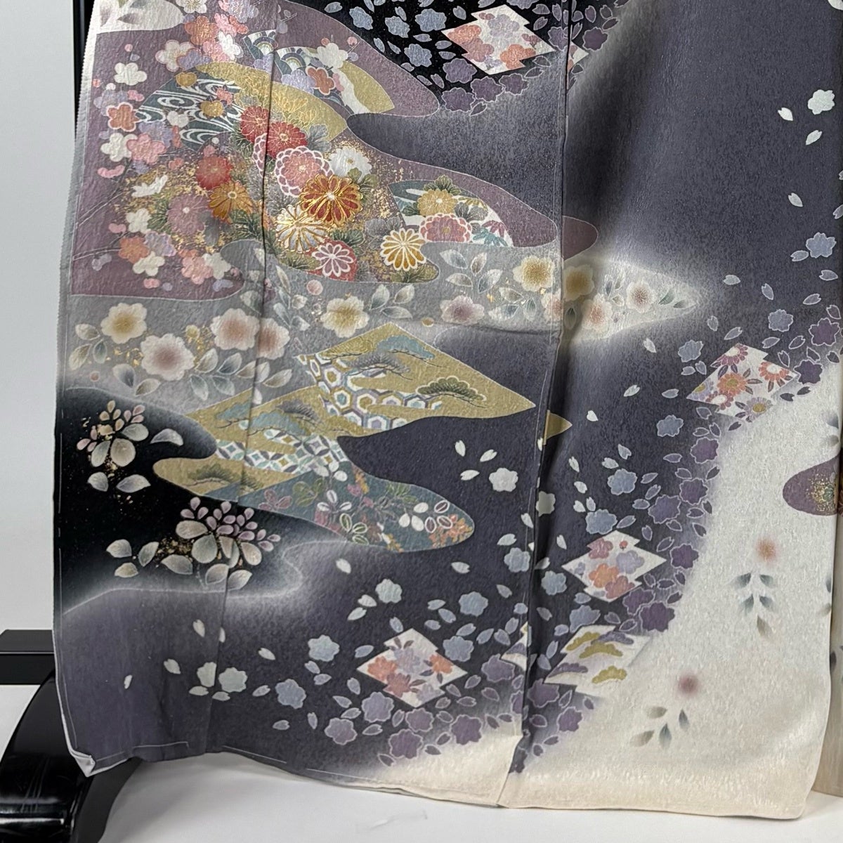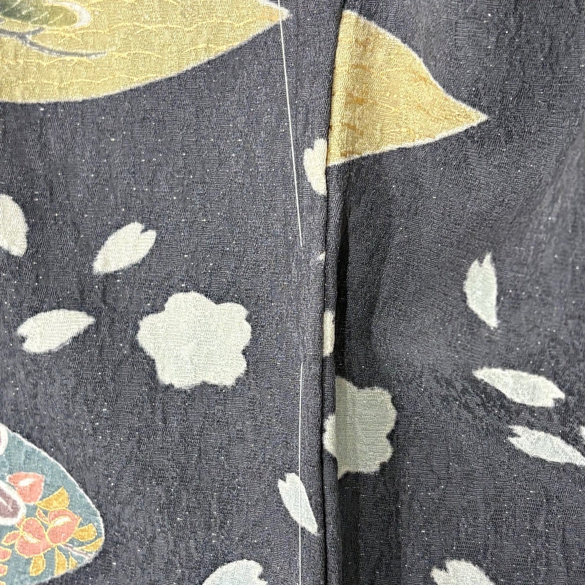 訪問着 身丈157cm 裄丈64cm M 袷 落款あり 鶴 秋草 金銀彩 螺鈿 墨色 正絹 名品
