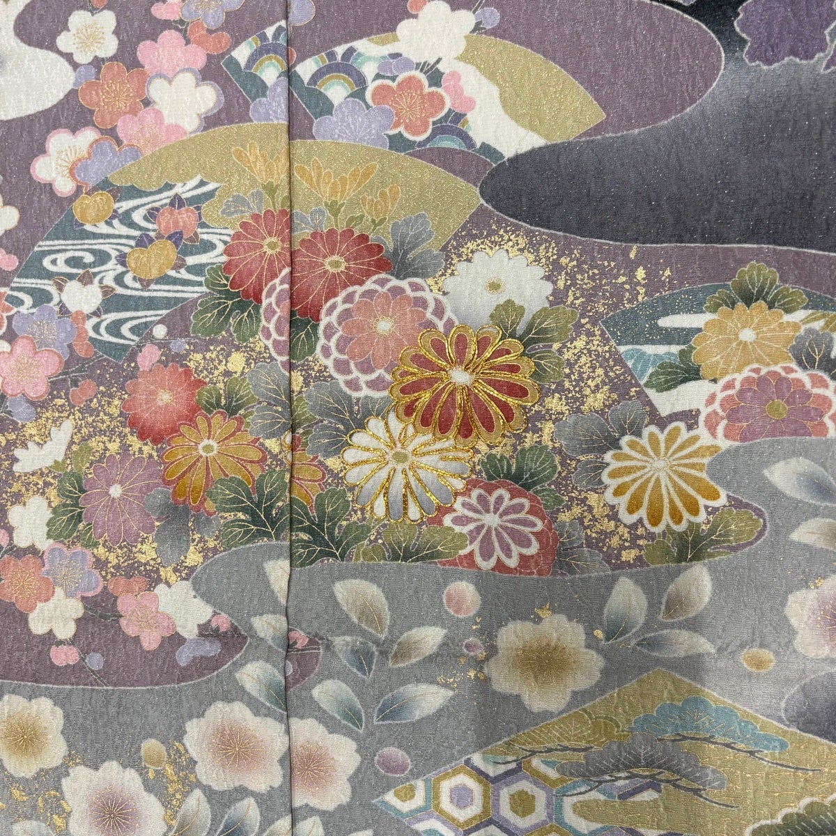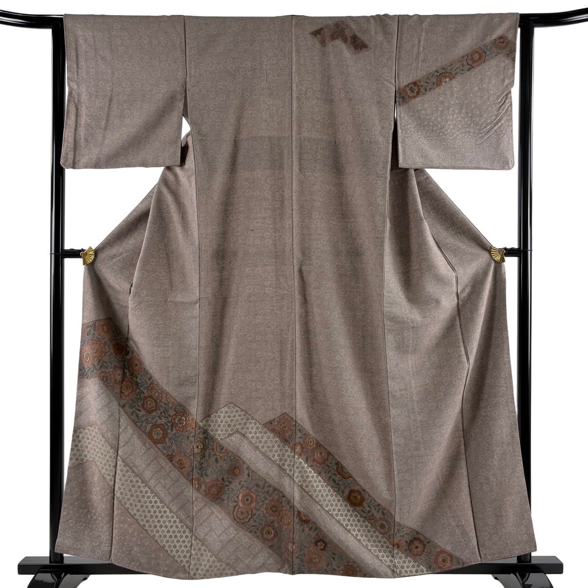 付下げ 身丈153.5cm 裄丈64cm M 袷 花唐草 向かい鳥 ラメ 金彩 灰茶 正絹 名品