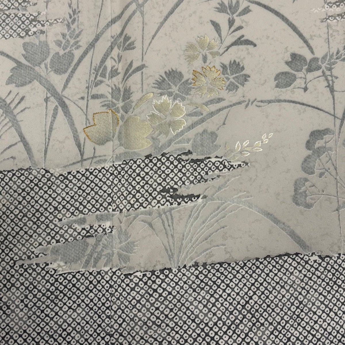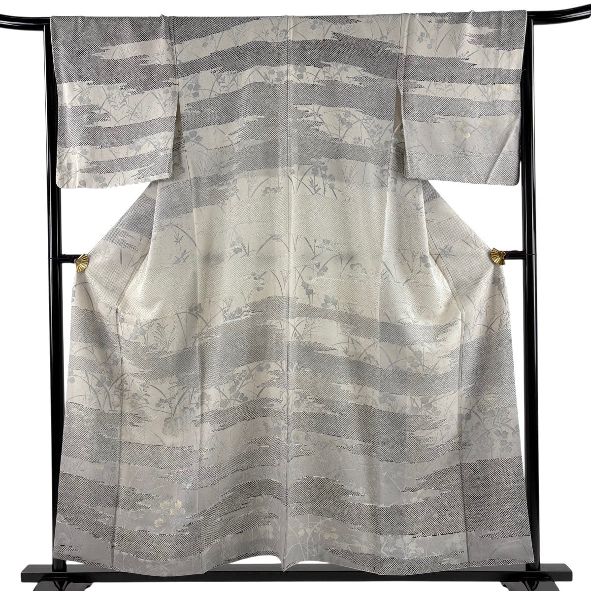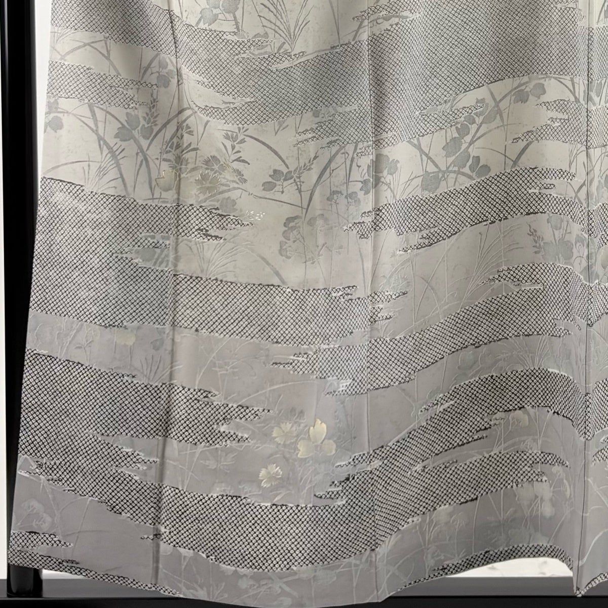 小紋 身丈162cm 裄丈66cm M 袷 草野一騎 落款あり 枝花 縦ぼかし 灰色 正絹 名品
