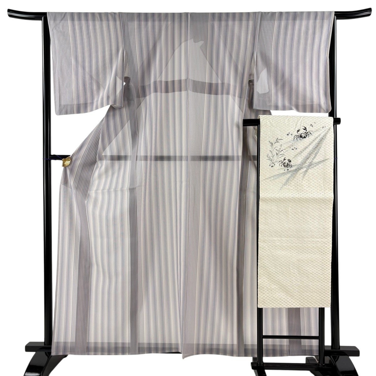 【美品】 小紋 身丈157.5cm 裄丈63cm S 袷 横段 幾何学 ぼかし 薄紫 正絹 名品