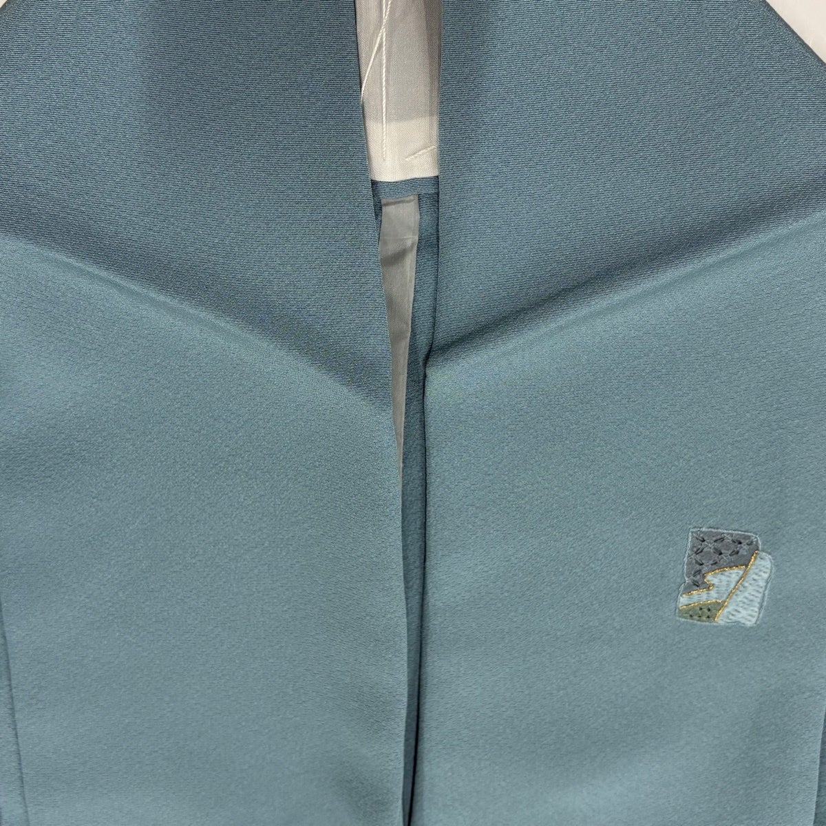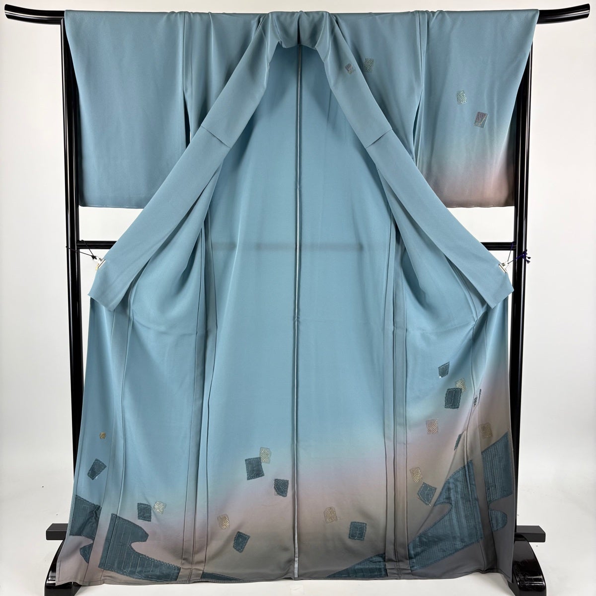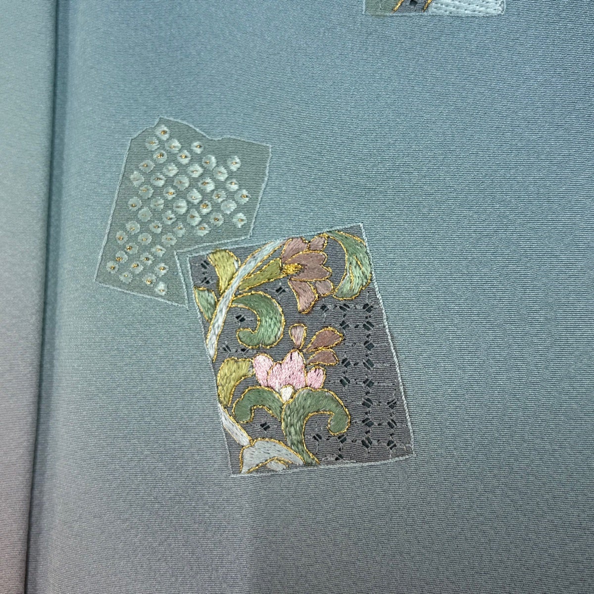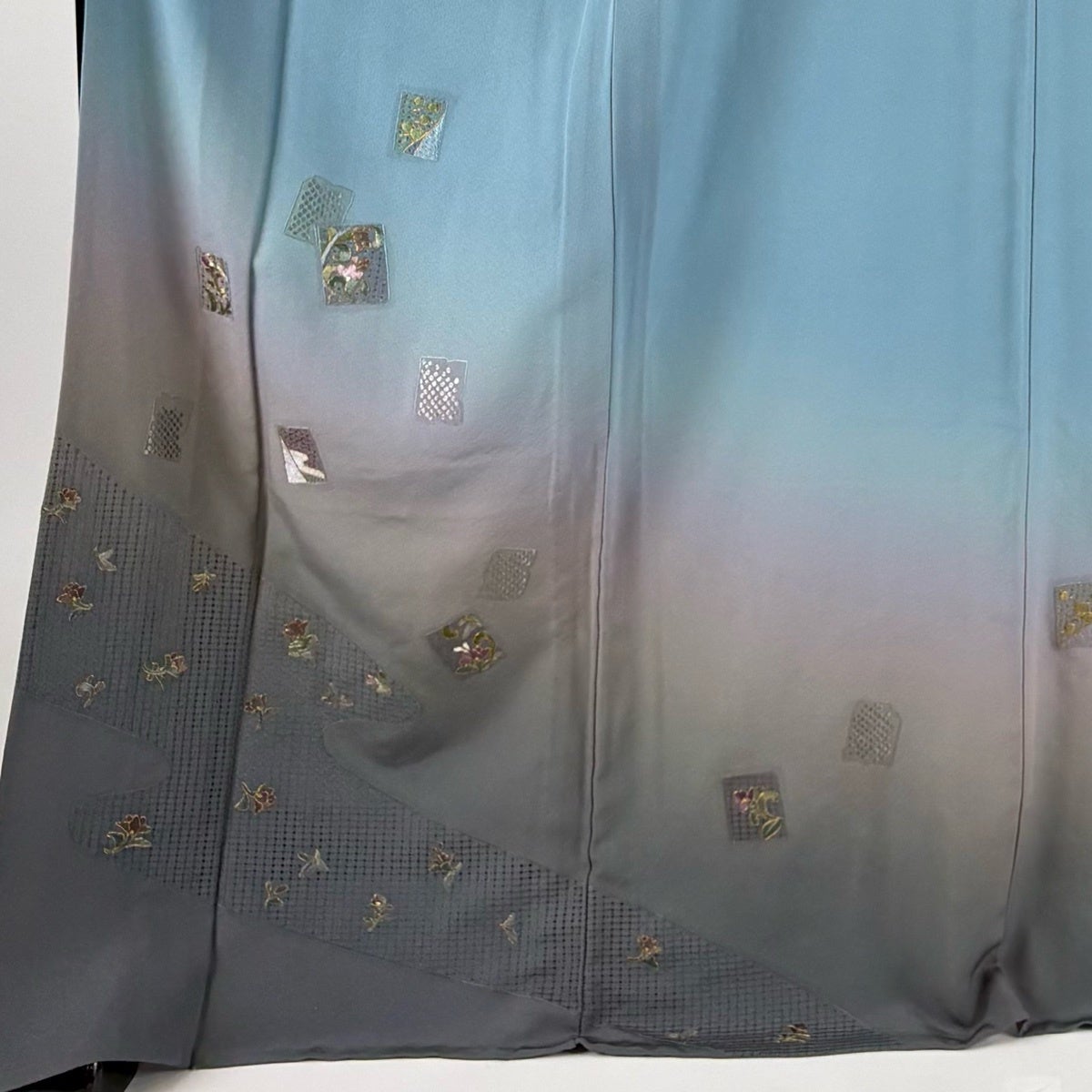 訪問着 身丈155cm 裄丈63cm S 単衣 落款あり 草花 染め分け ぼかし 灰緑 正絹 名品