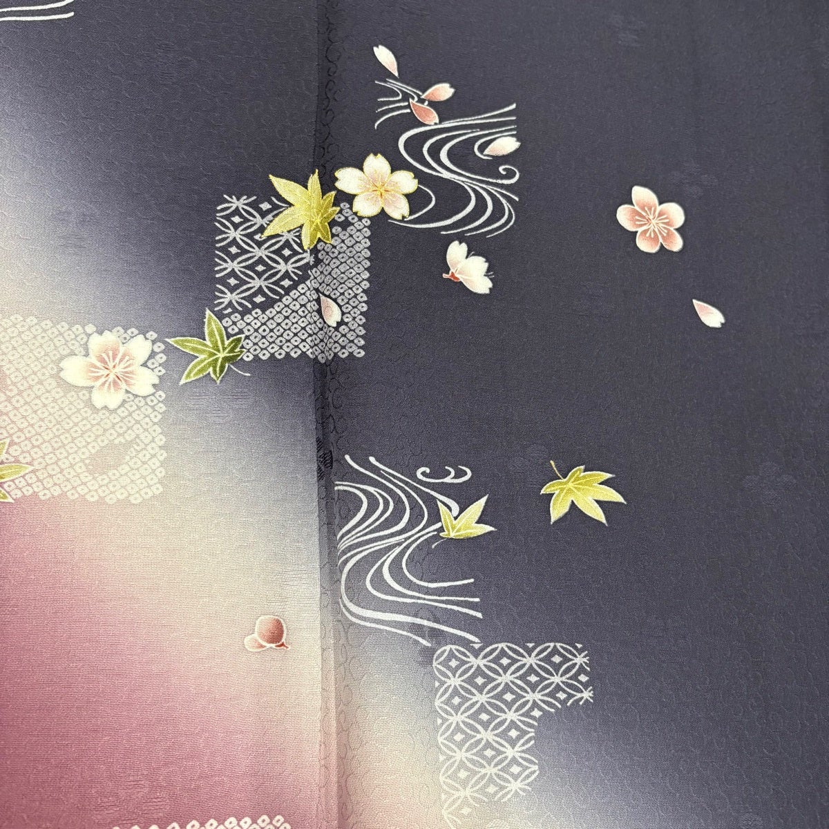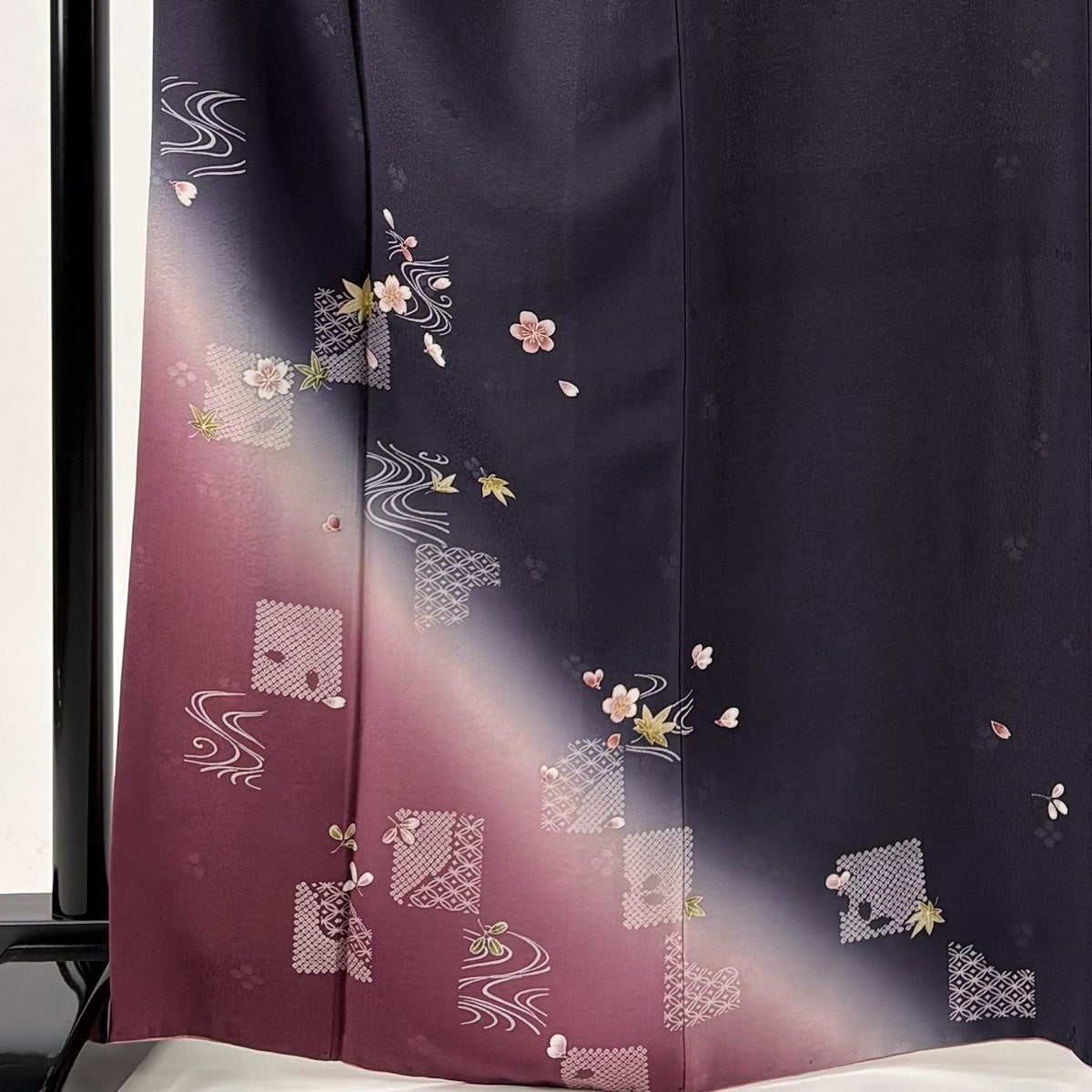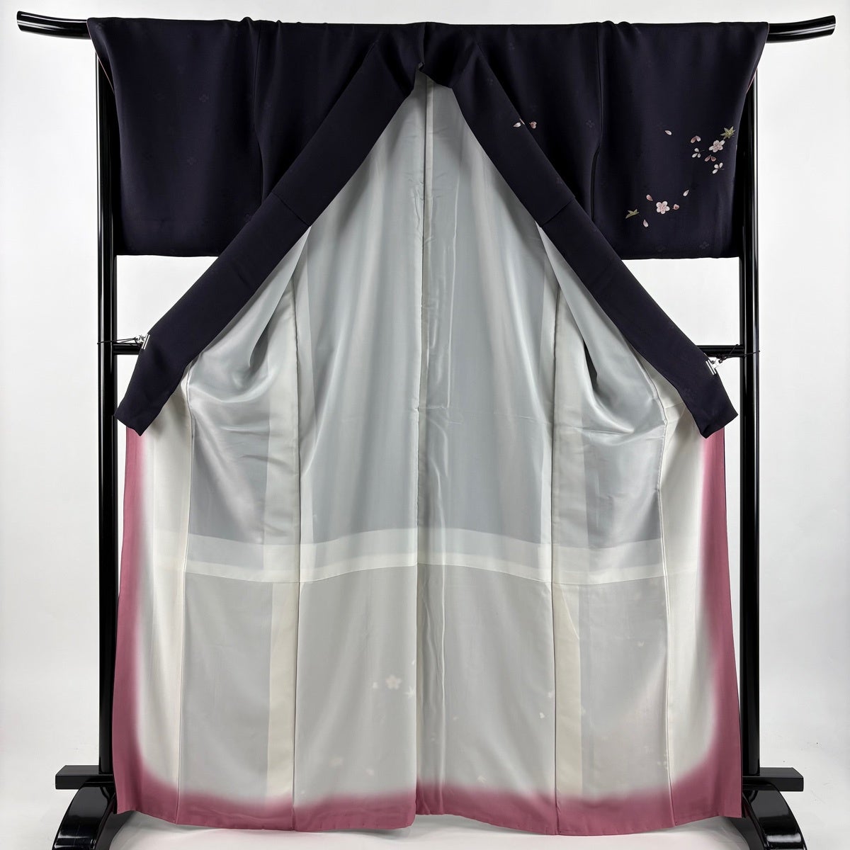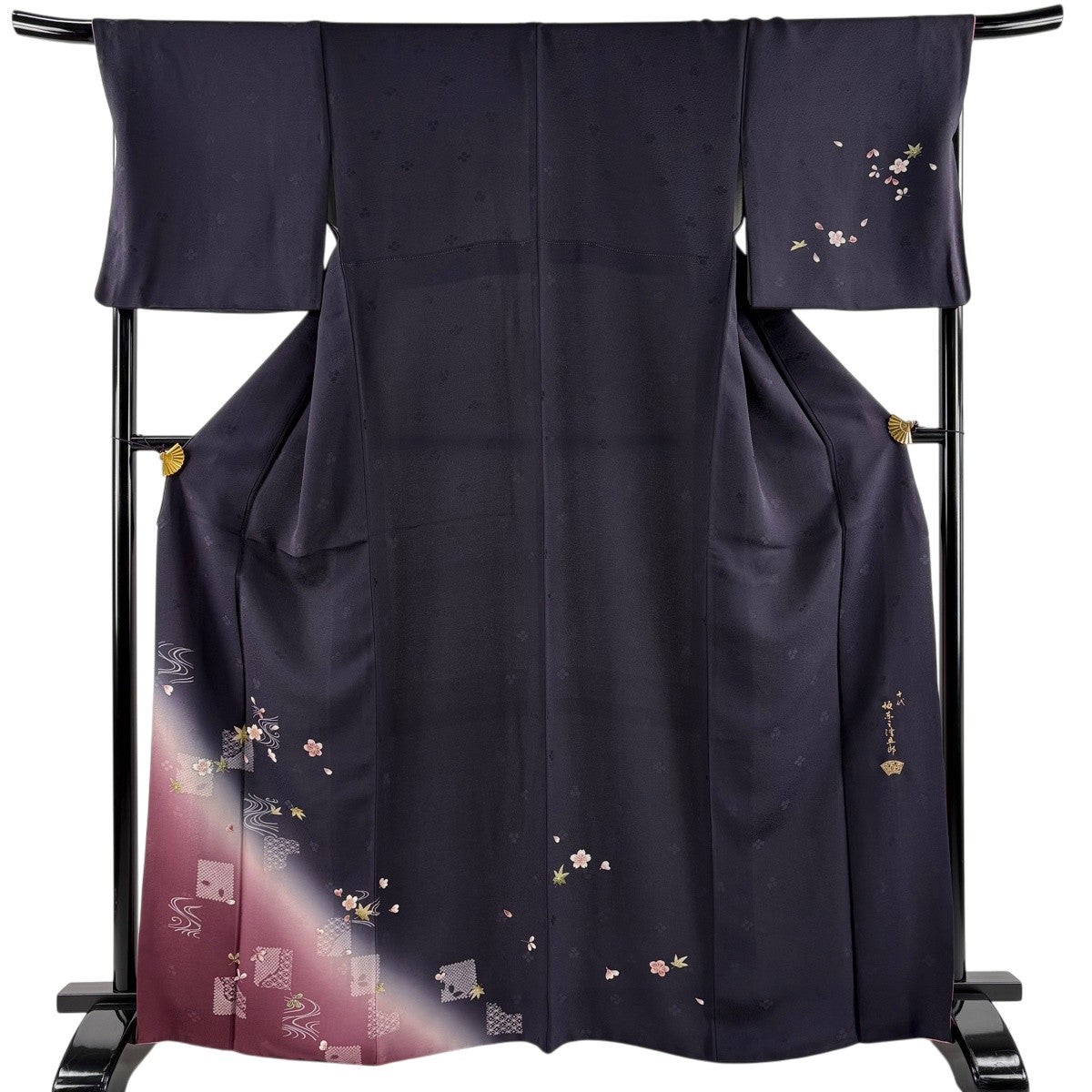【美品】 付下げ 身丈166cm 裄丈69.5cm L 袷 坂東三津五郎 やまと 落款あり 桜 流水 金彩 ぼかし 濃紫 正絹 名品