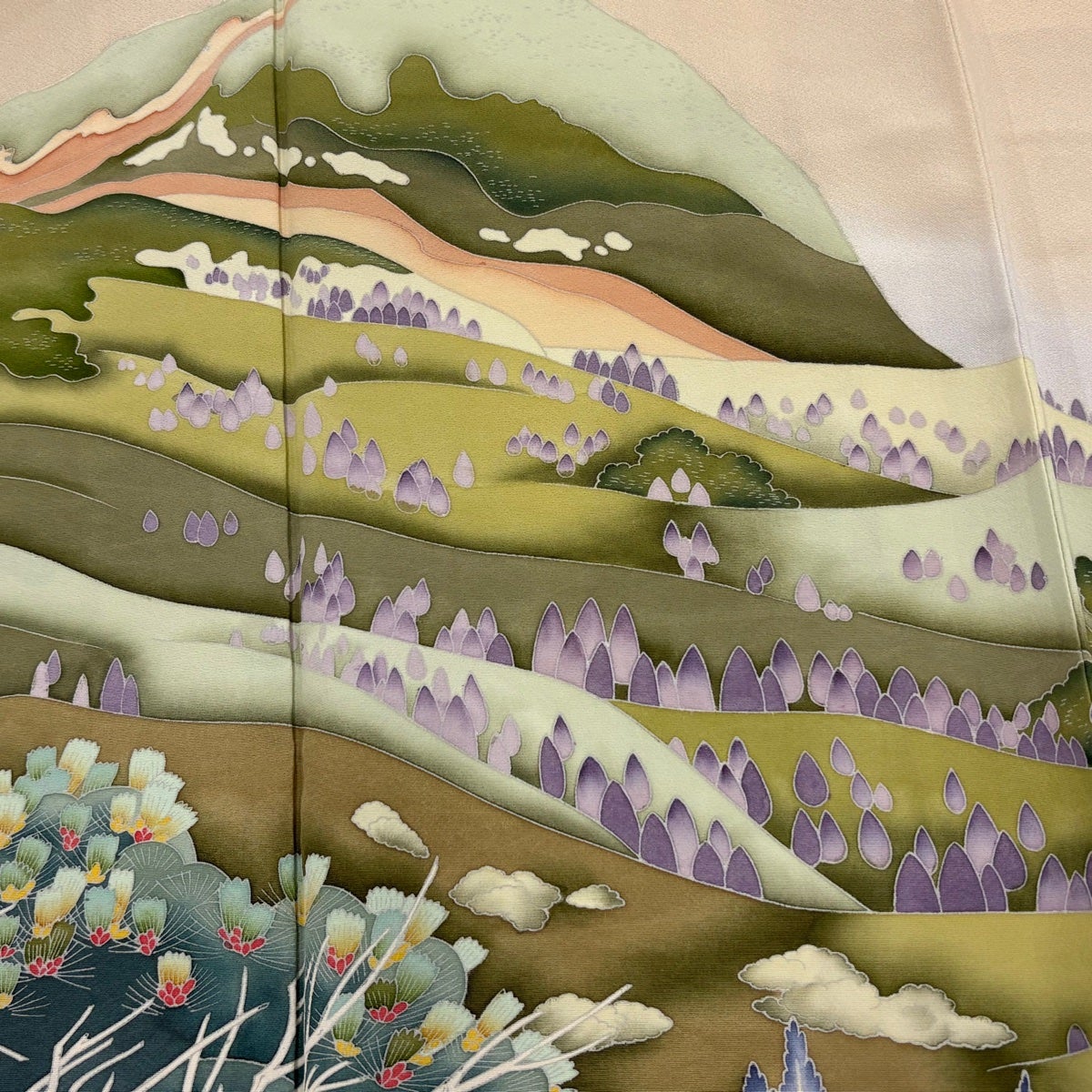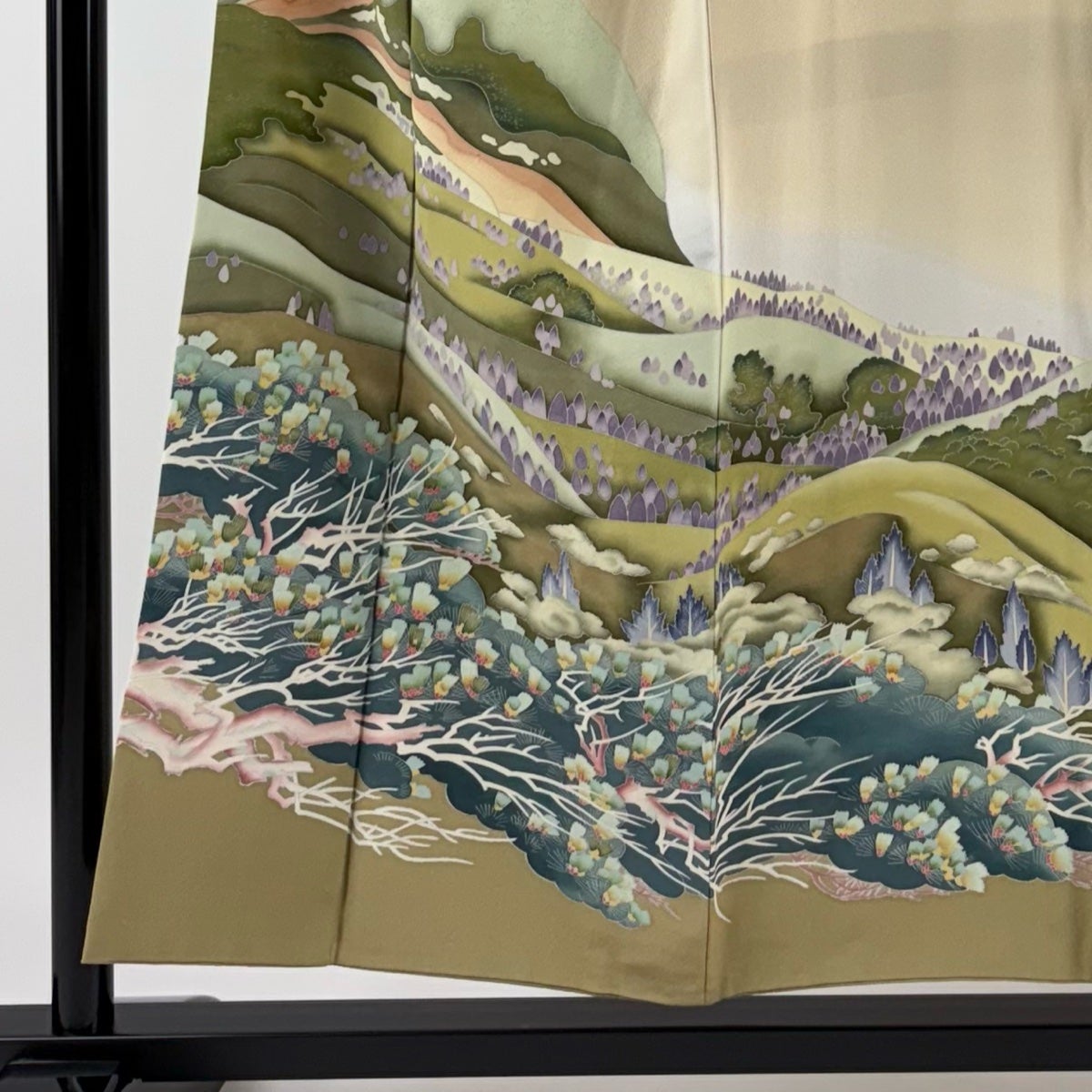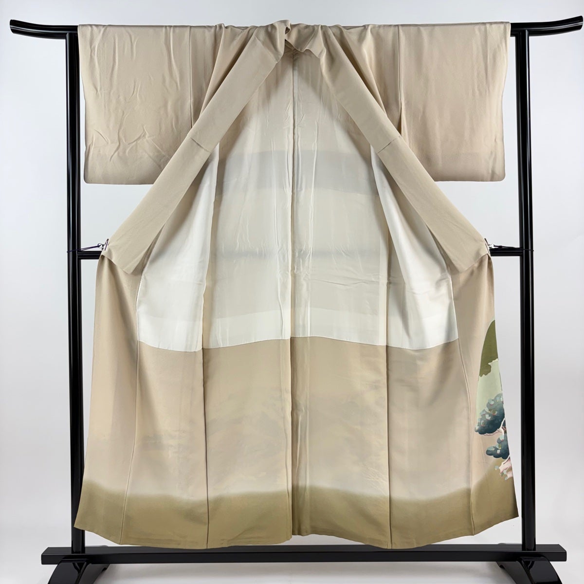 【在庫一掃】 色留袖 身丈154cm 裄丈61.5cm S 袷 松本健一 落款あり 山並み 松 ぼかし ベージュ 正絹 名品 一つ紋