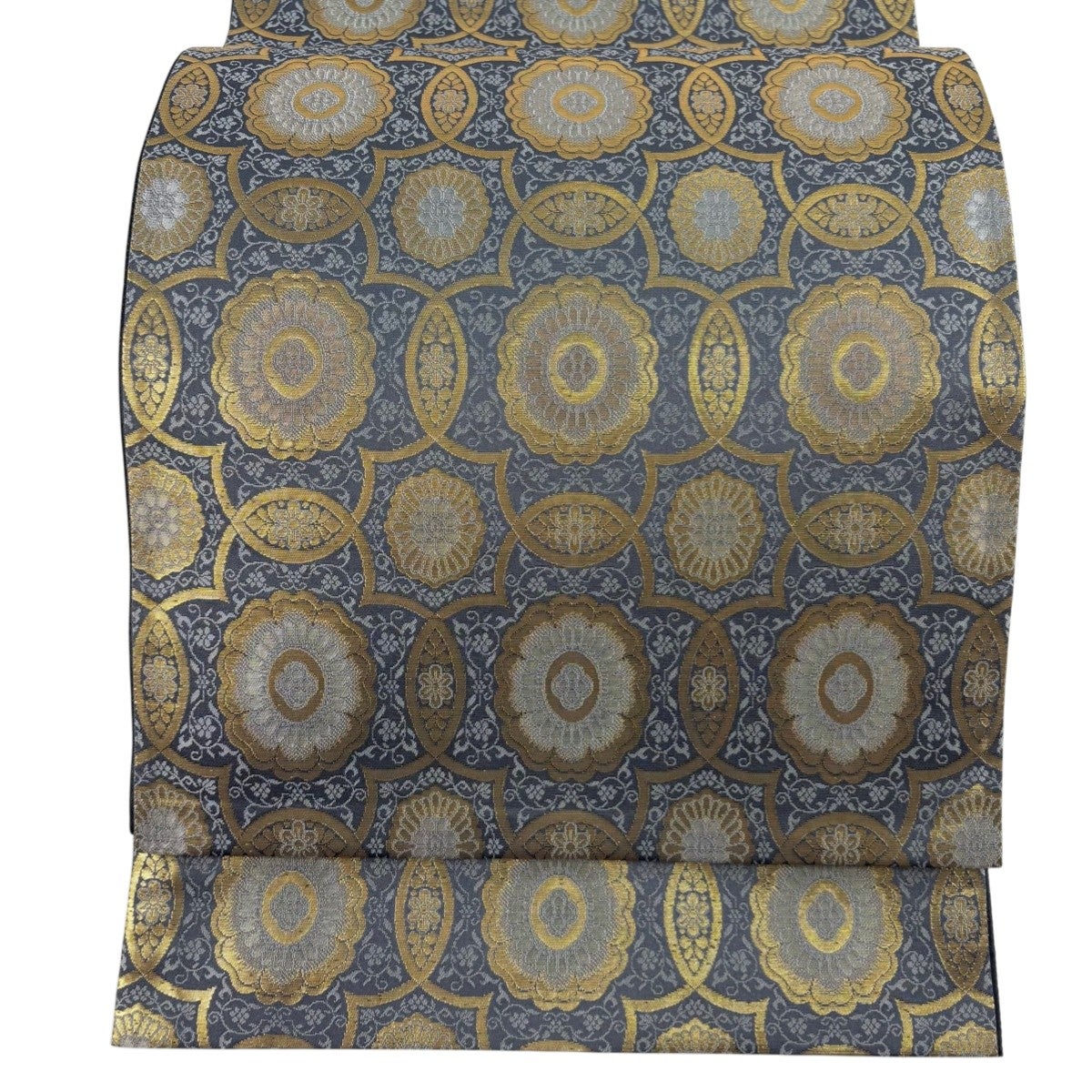 【美品】 袋帯 秀品 意匠保全 古代裂名品集 華文 花唐草 箔 草木染 青灰色 六通 正絹