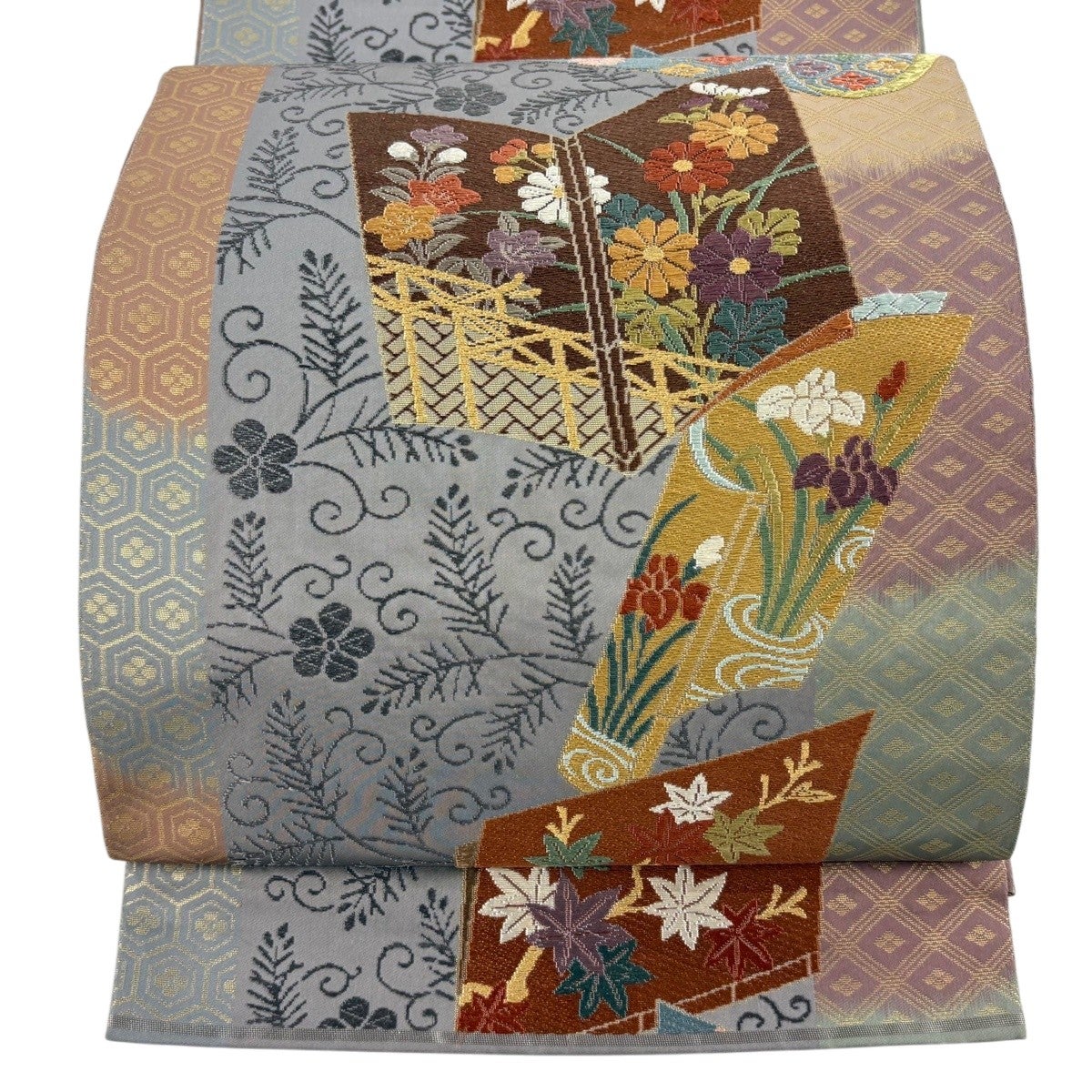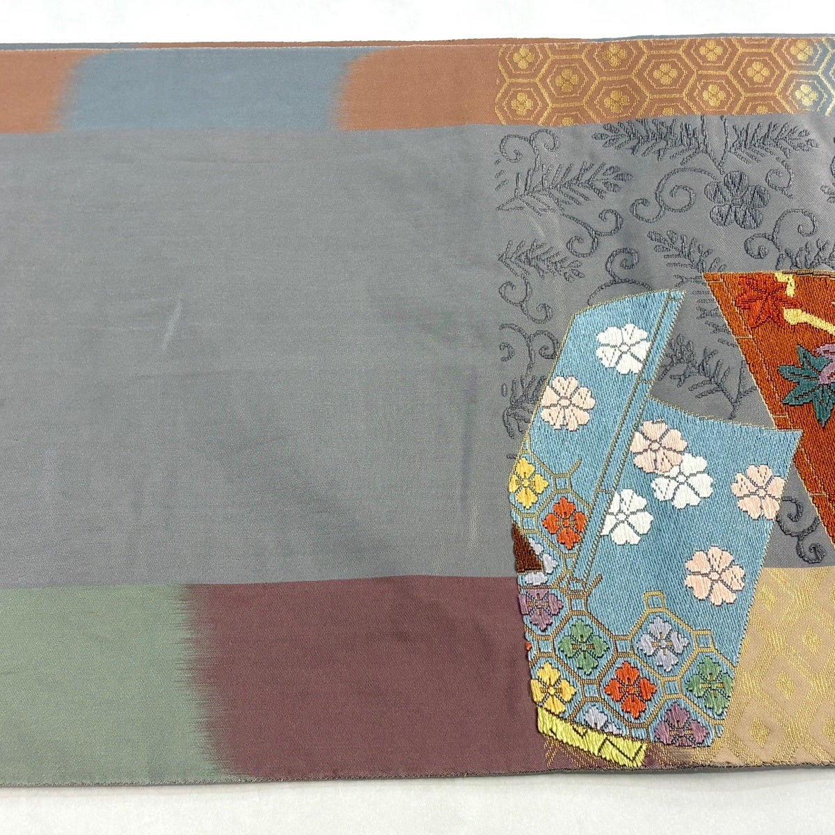 【美品】 袋帯 秀品 華文 流水 金糸 唐織 灰茶 六通 正絹