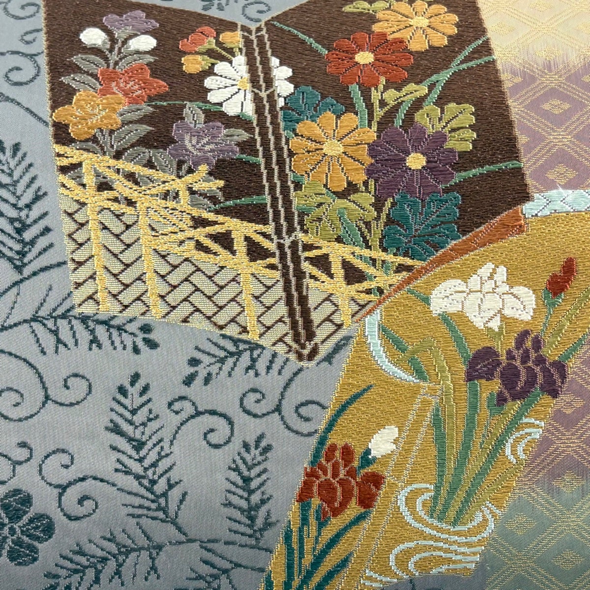 名古屋帯 秀品 関西仕立て 牡丹 籠目 唐織 金糸 灰緑 正絹