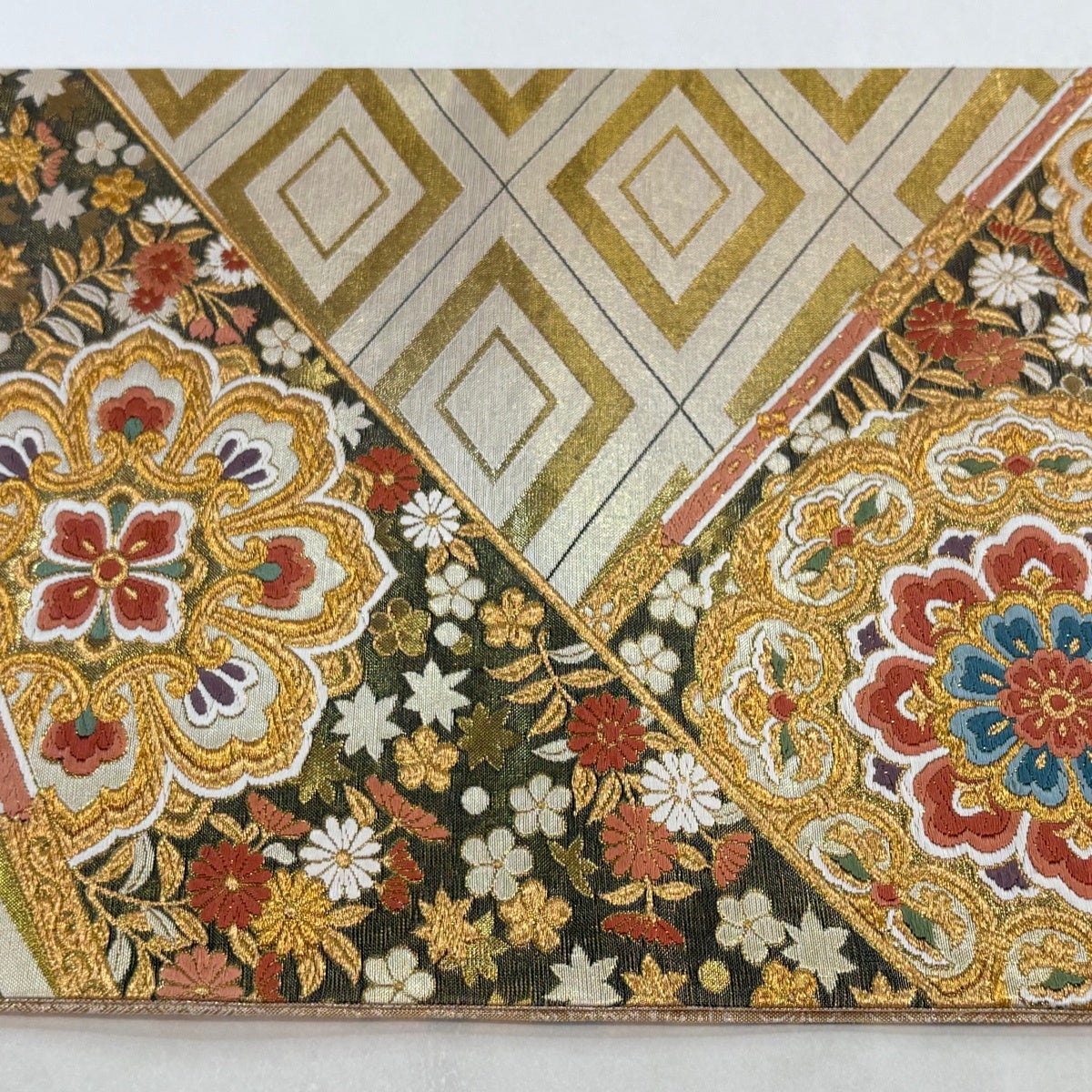 【美品】 袋帯 秀品 菊 花鳥 唐織 箔 クリーム 六通 正絹