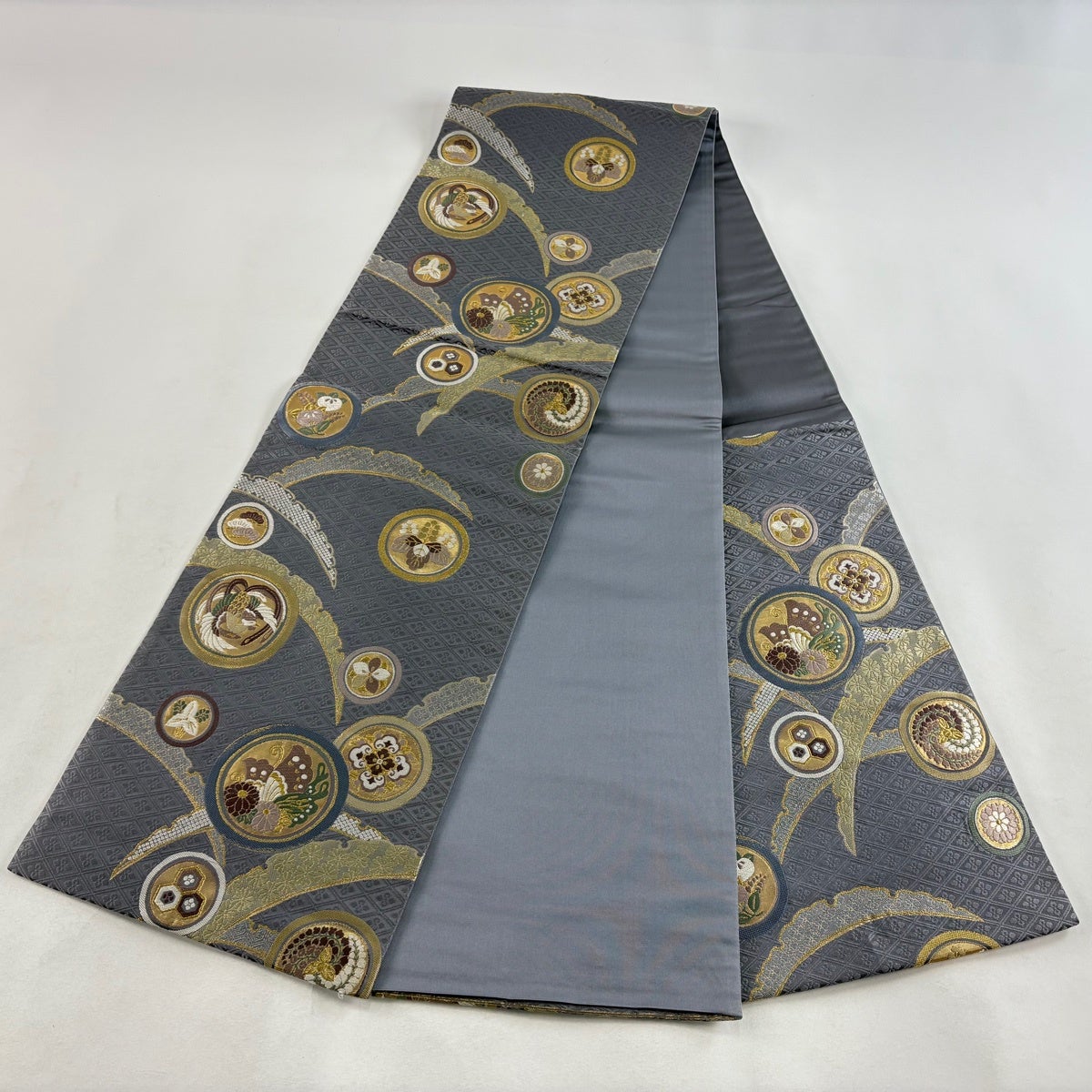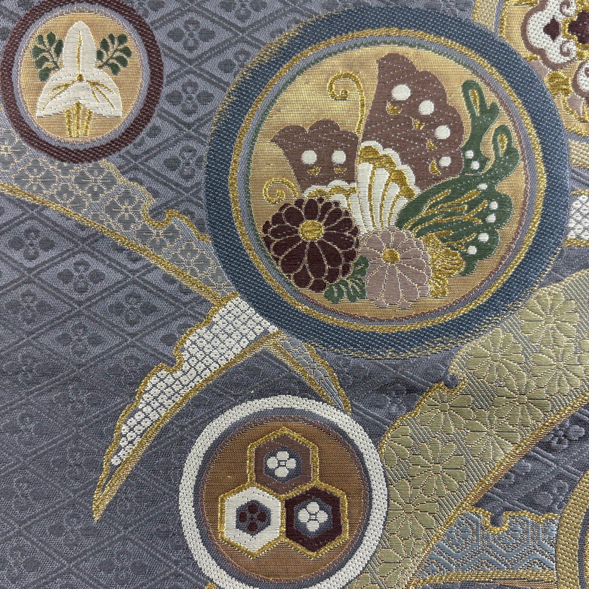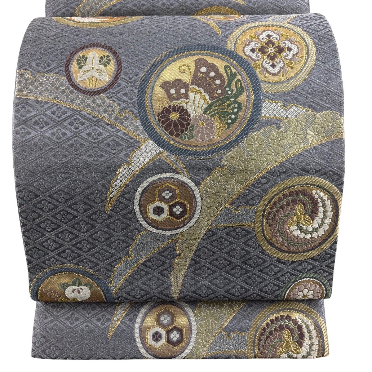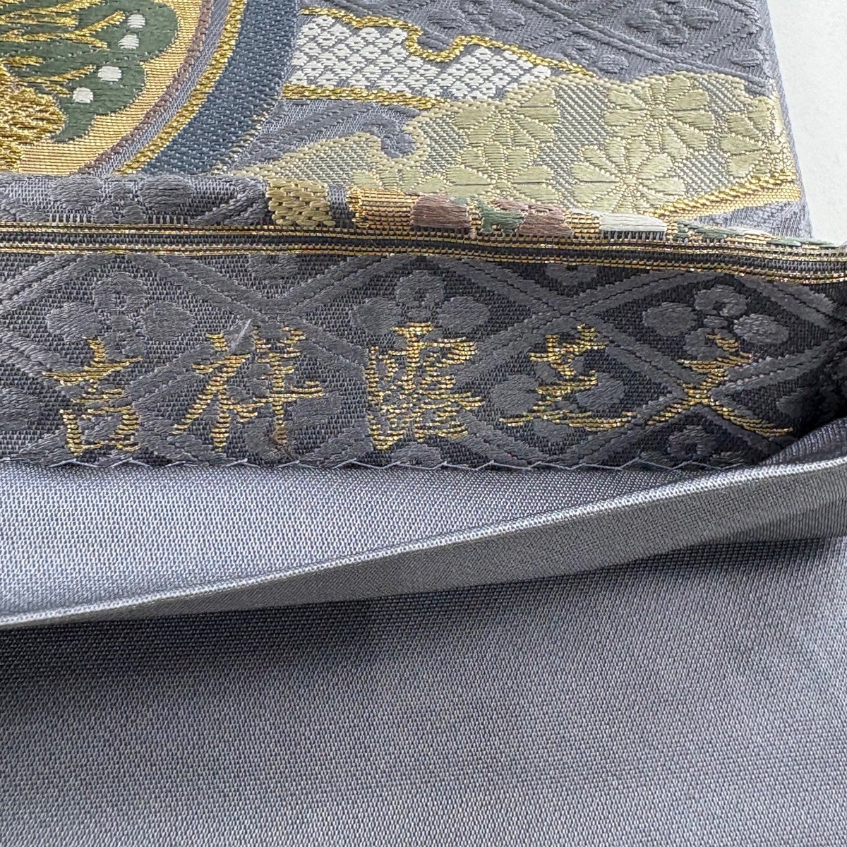 袋帯 秀品 関西仕立て 笠松 七宝 唐織 箔 灰色 六通 正絹