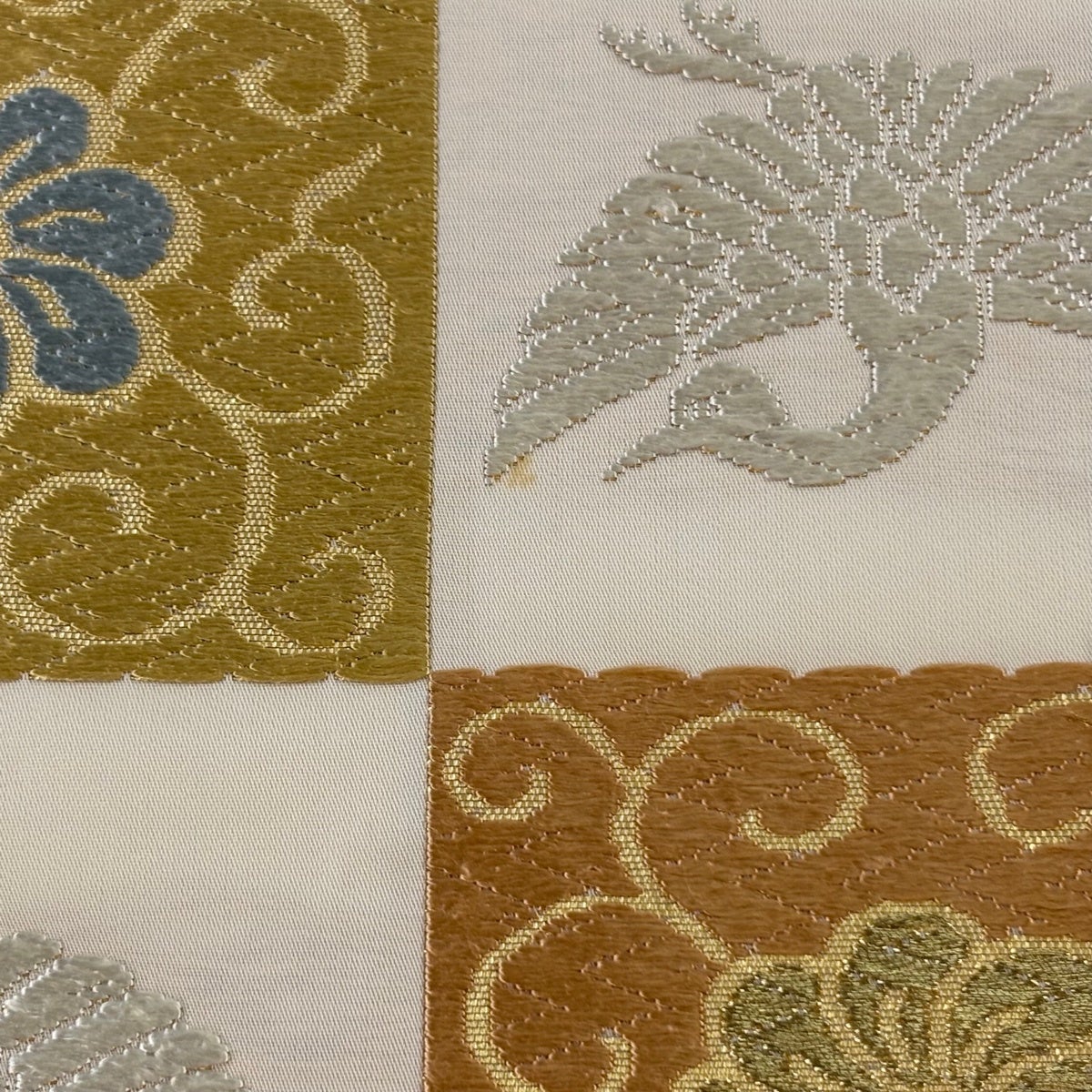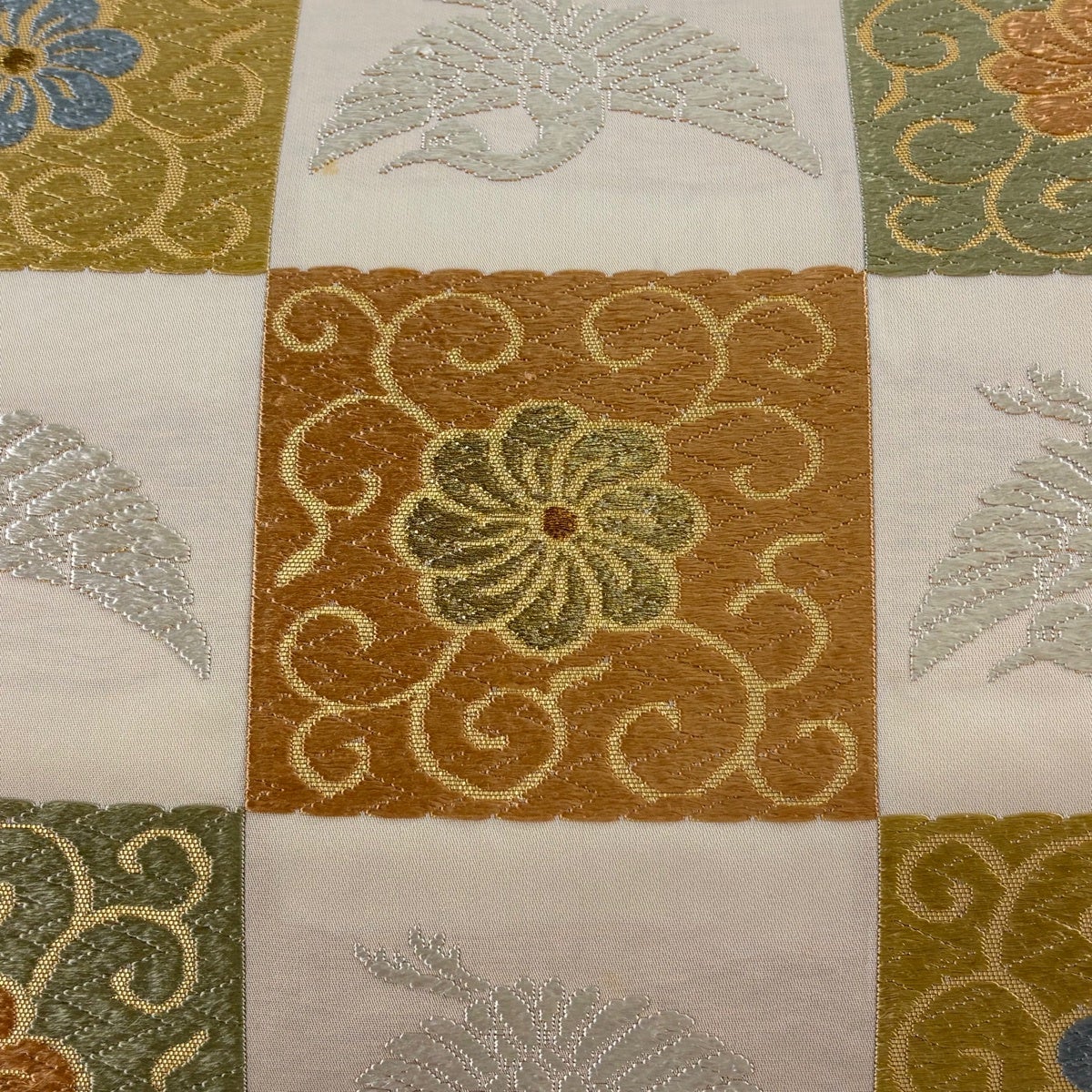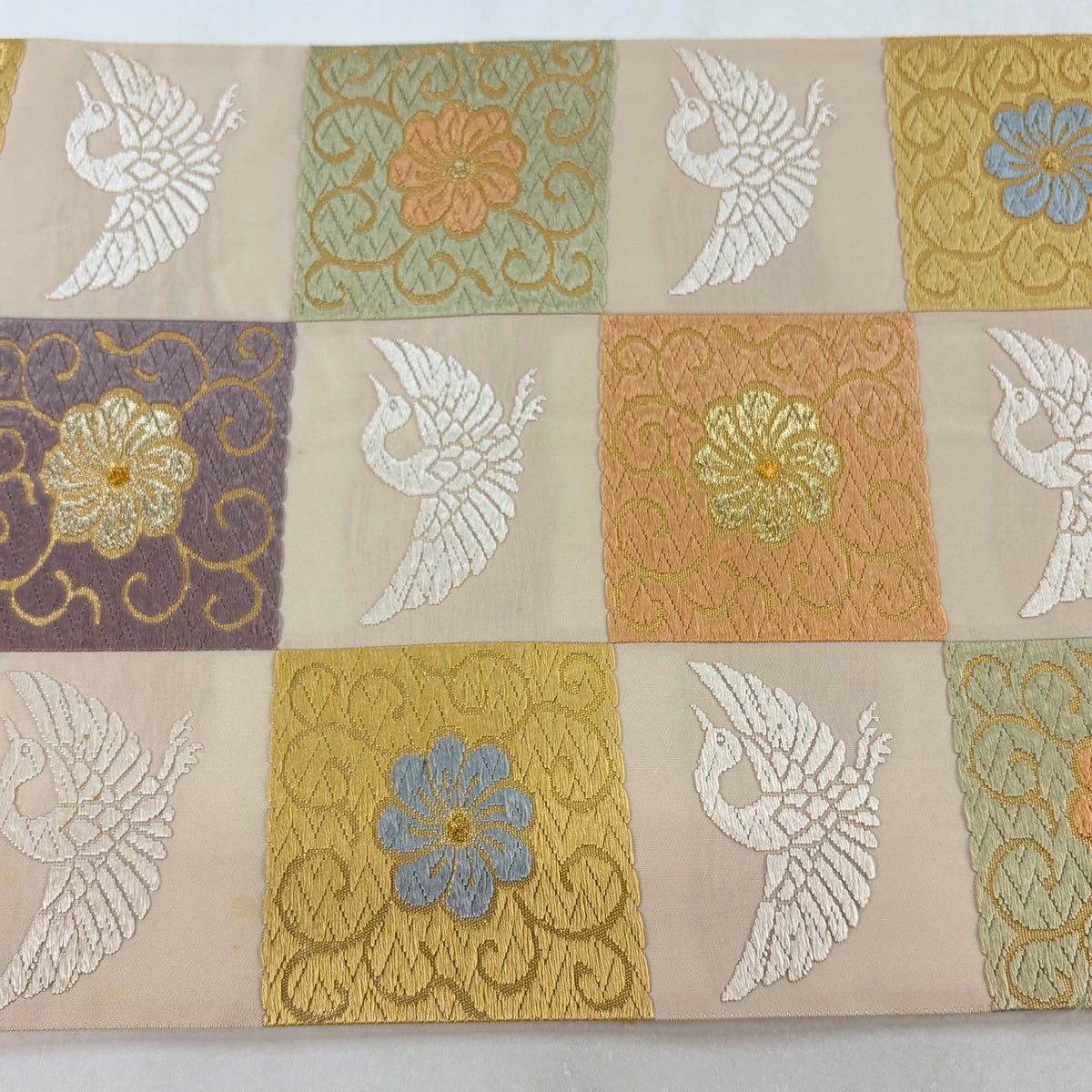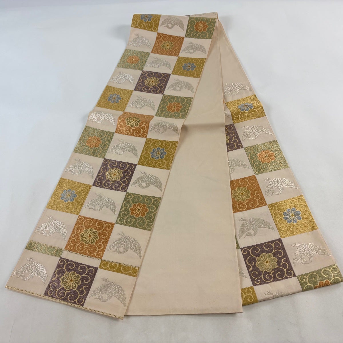 【美品】 袋帯 秀品 菊唐草 向かい鶴 唐織 箔 クリーム 六通 正絹