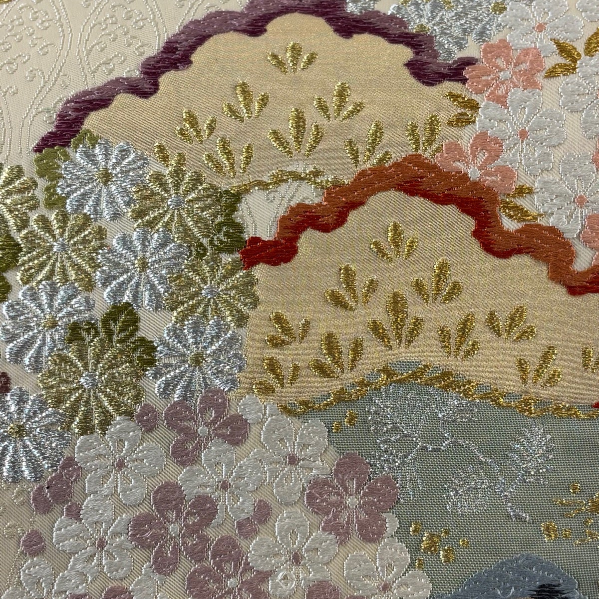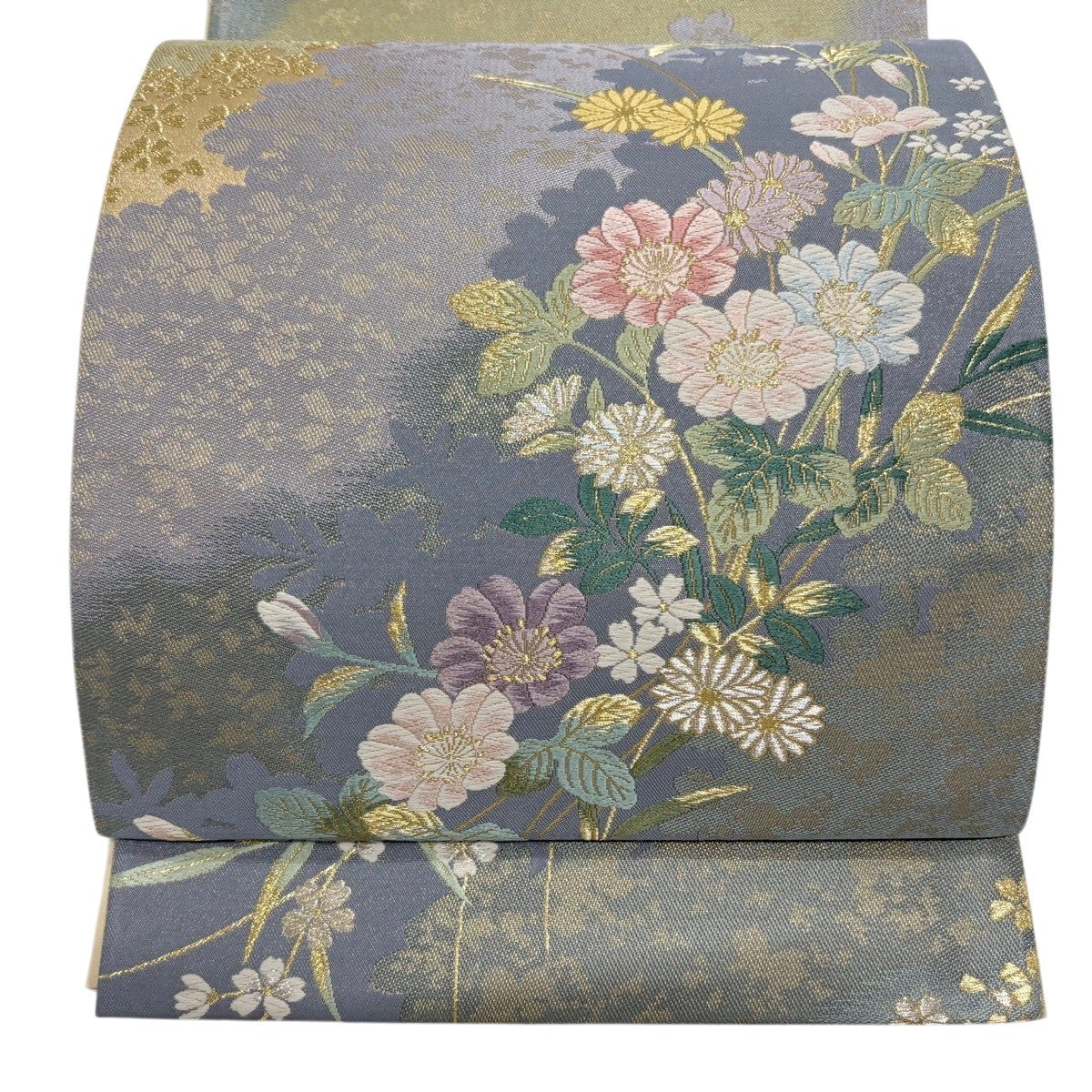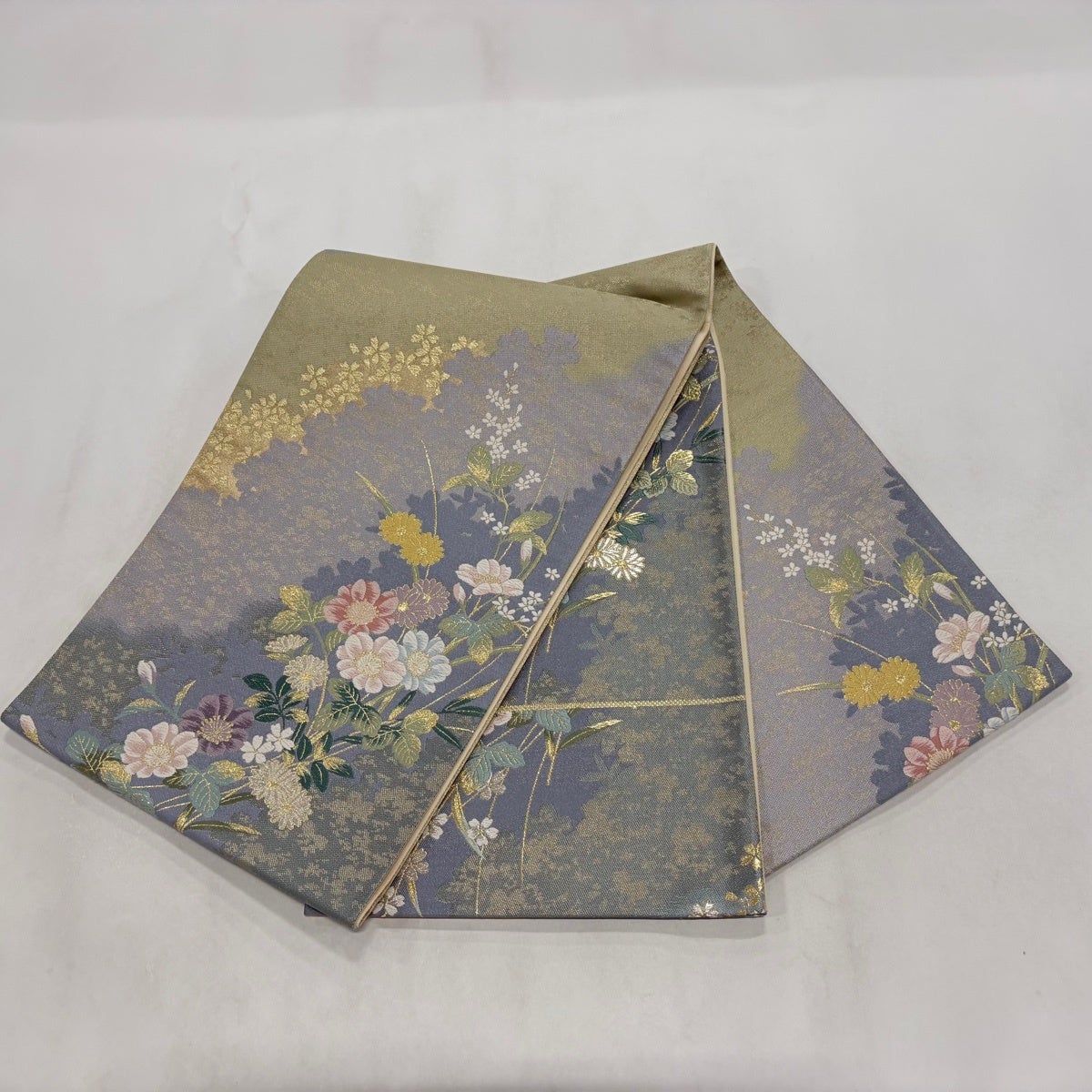 【美品】 袋帯 秀品 草花 シルエット 金銀糸 唐織 灰紫 六通 正絹