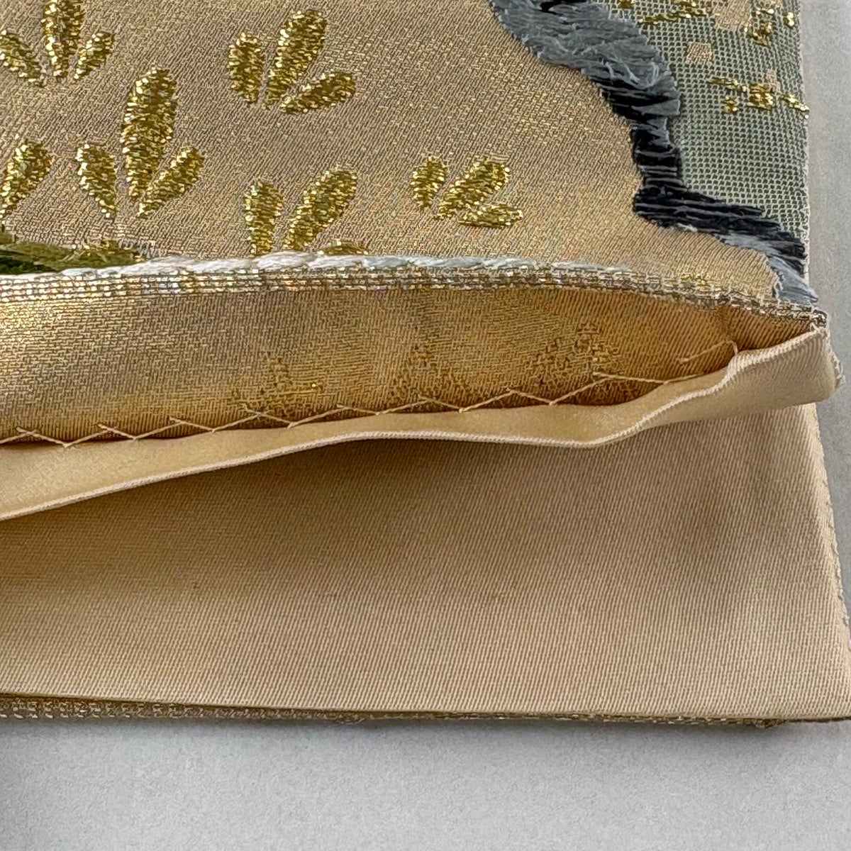 袋帯 秀品 関西仕立て 花唐草 鳥 唐織 箔 ベージュ 六通 正絹