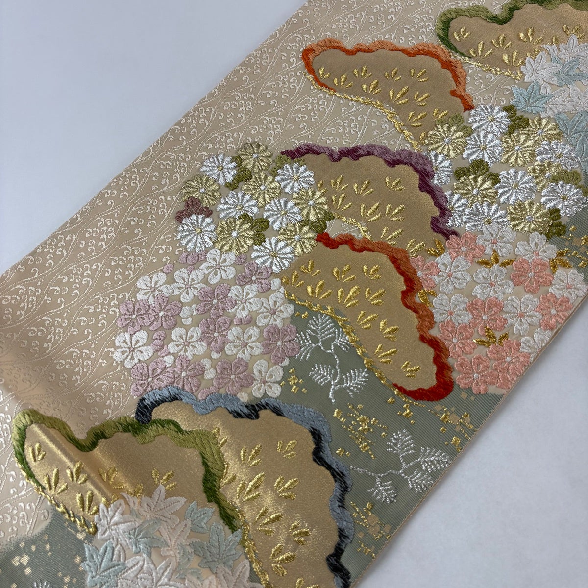 【美品】 袋帯 秀品 花菱 花唐草 唐織 金糸 ベージュ 六通 正絹