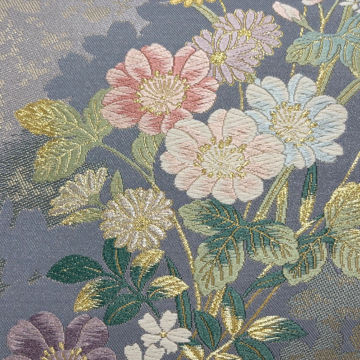 【美品】 袋帯 名品 公家加賀五彩 王朝菊華文 唐織 灰紫 六通 正絹