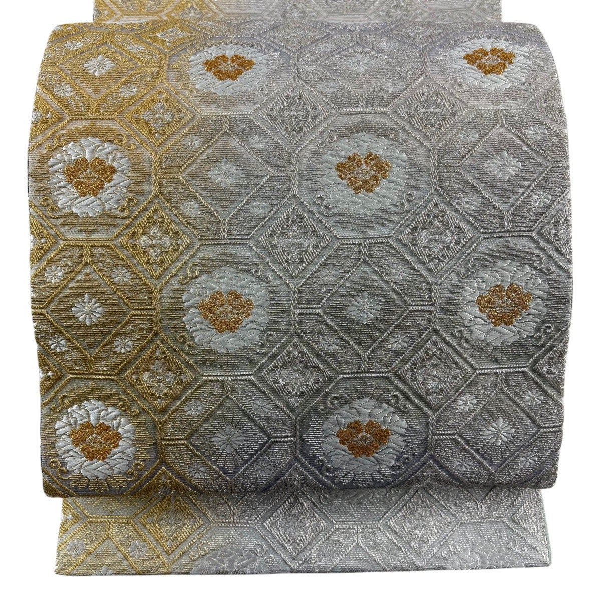 袋帯 名品 証紙あり 華文 亀甲 金糸 唐織 ベージュ 六通 正絹