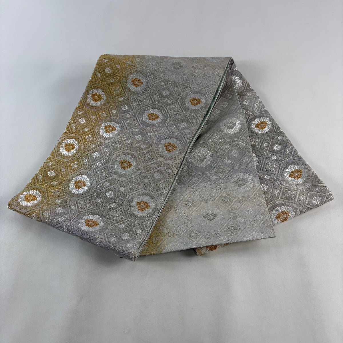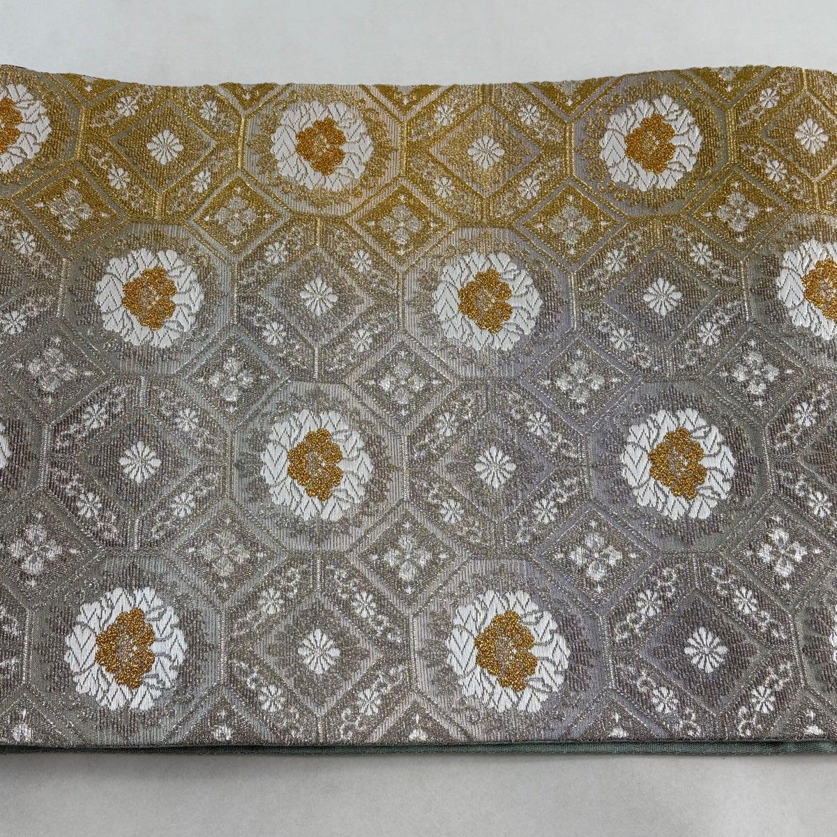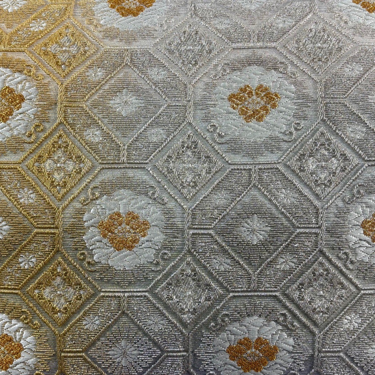 【美品】 袋帯 秀品 関西仕立て 菊 笠松 唐織 箔 金色 六通 正絹