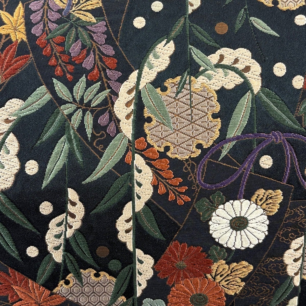 袋帯 名品 花井幸子 落款あり 草花 置物 唐織 箔 深緑 六通 正絹