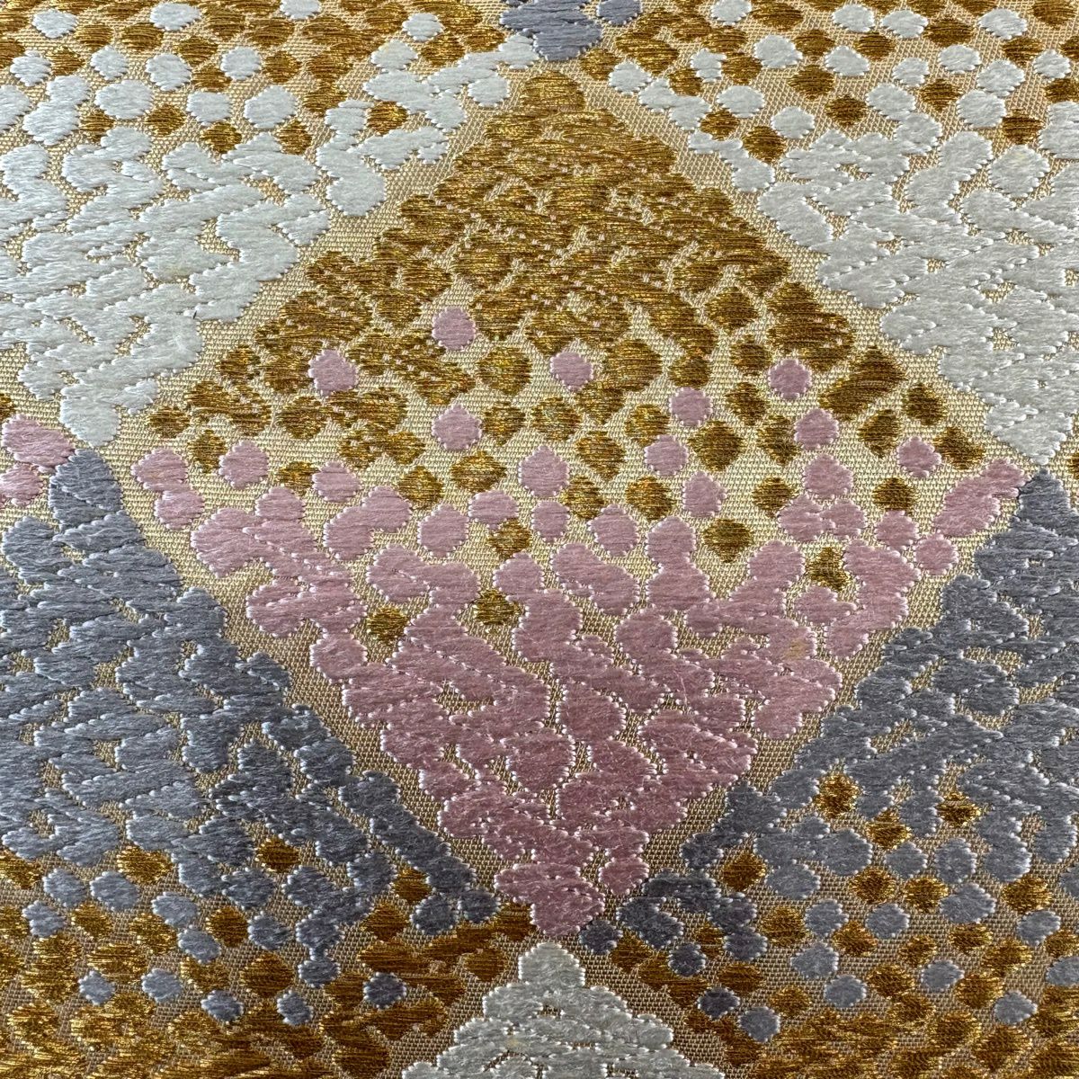 袋帯 秀品 振袖向き 華文 斜め格子 金糸 唐織 ピンク 六通 正絹