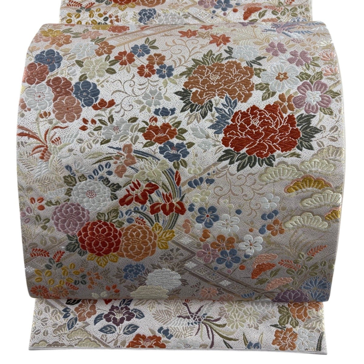 【美品】 袋帯 秀品 引箔九百織 色紙 花鳥 唐織 箔 灰白 六通 正絹