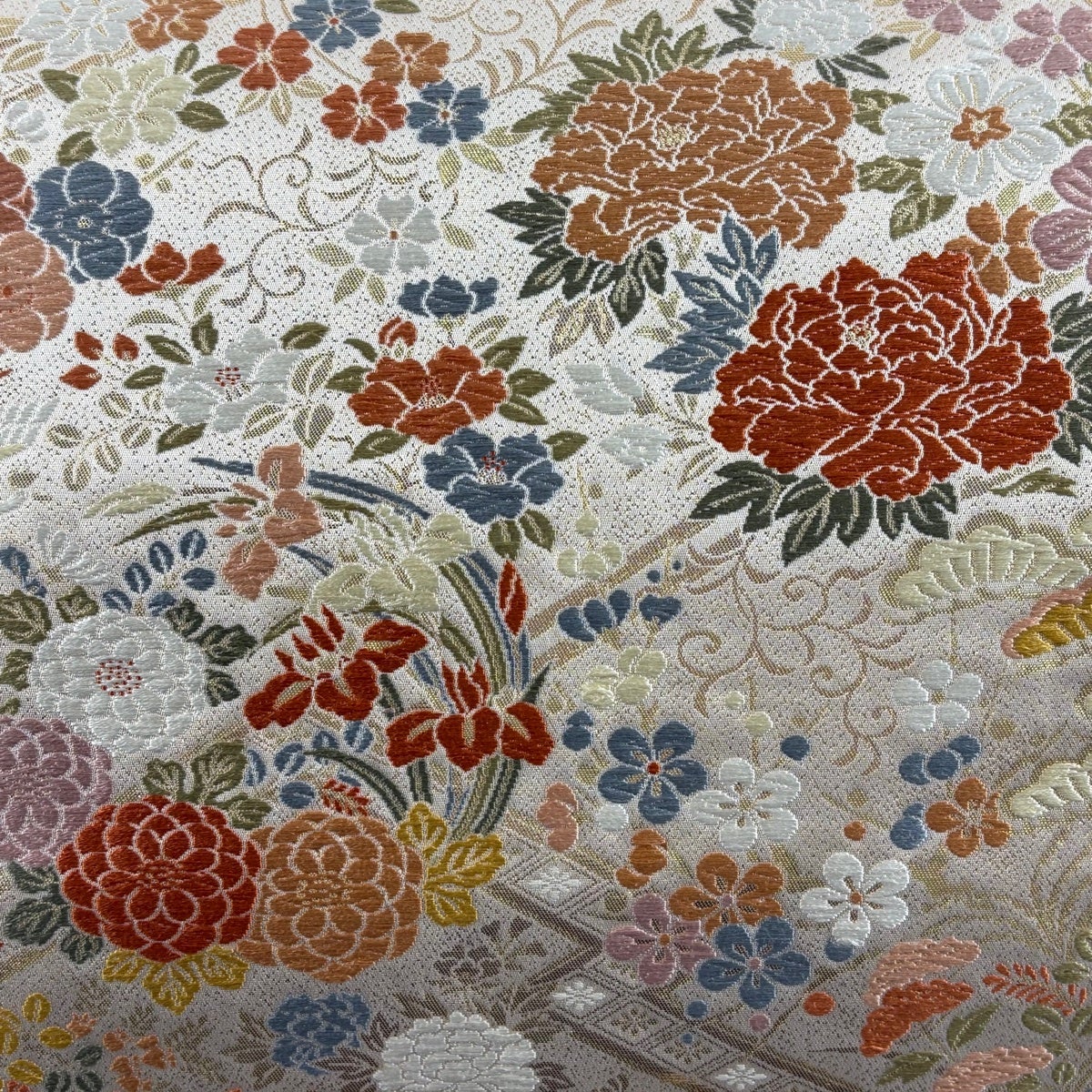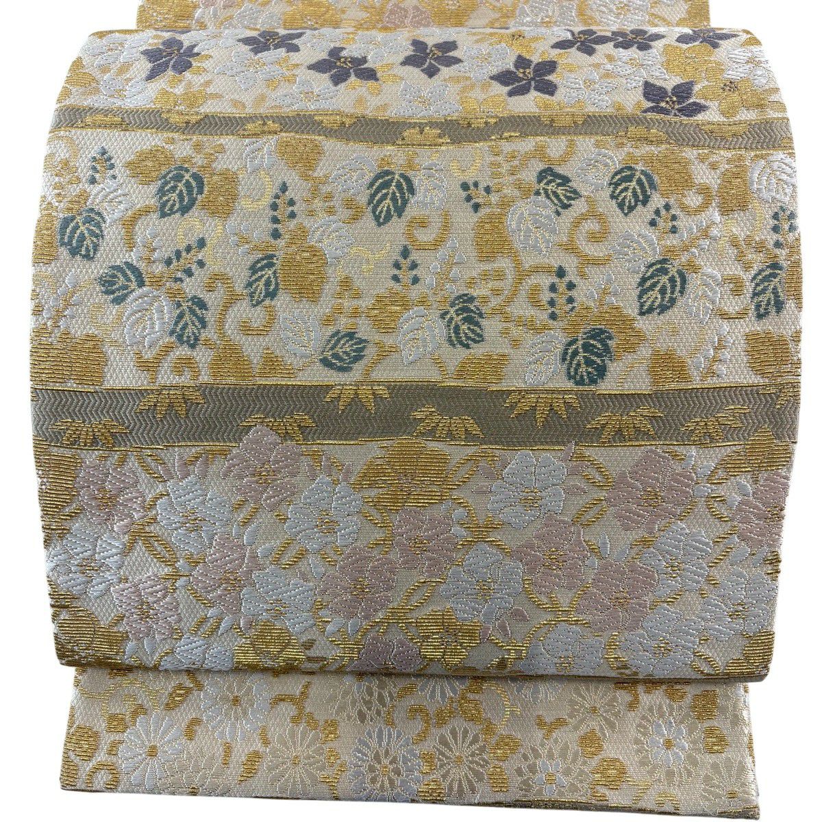 袋帯 秀品 関西仕立て 花束 松竹梅 唐織 箔 ベージュ 六通 正絹