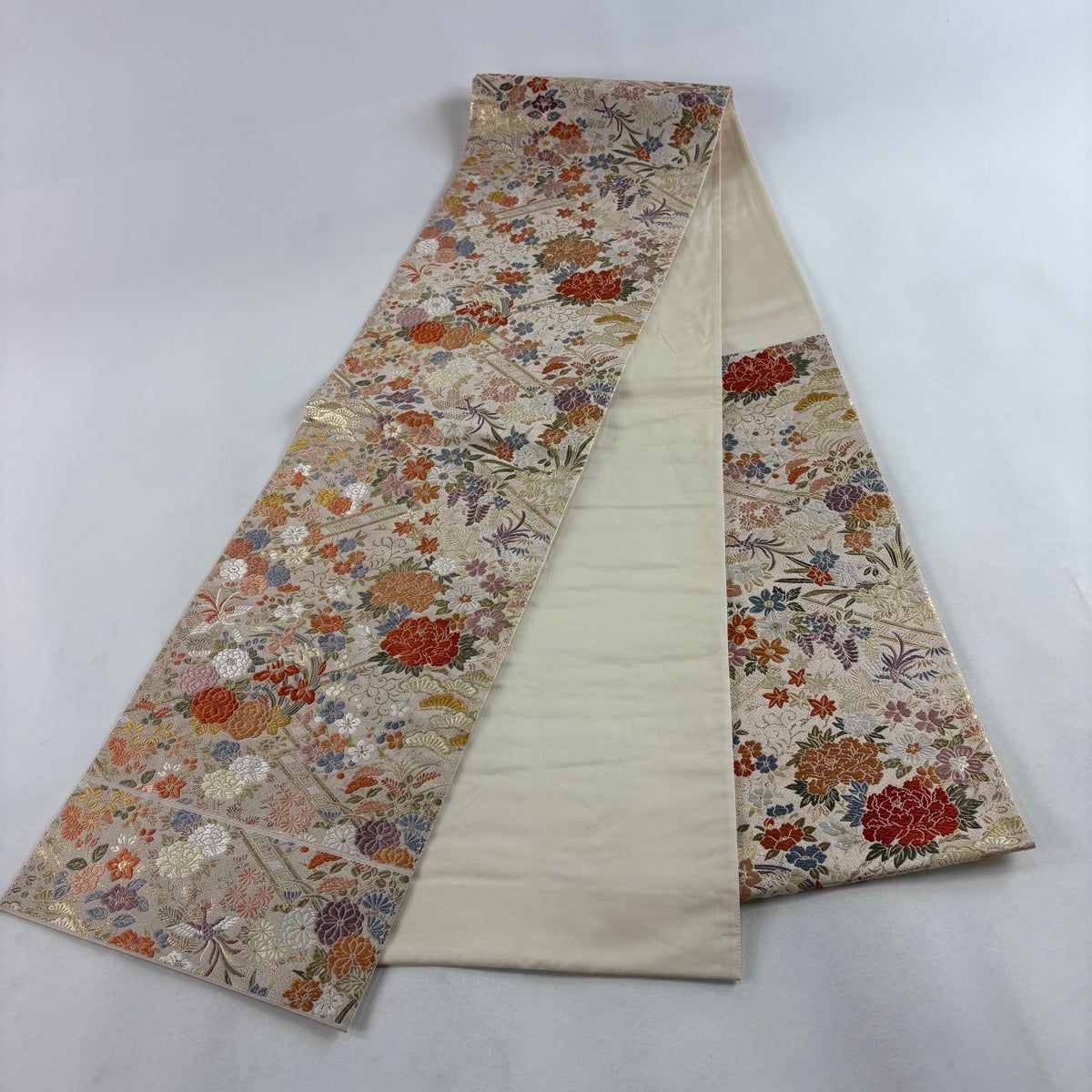 袋帯 秀品 関西仕立て 扇面 草花 金糸 唐織 ベージュ 六通 正絹