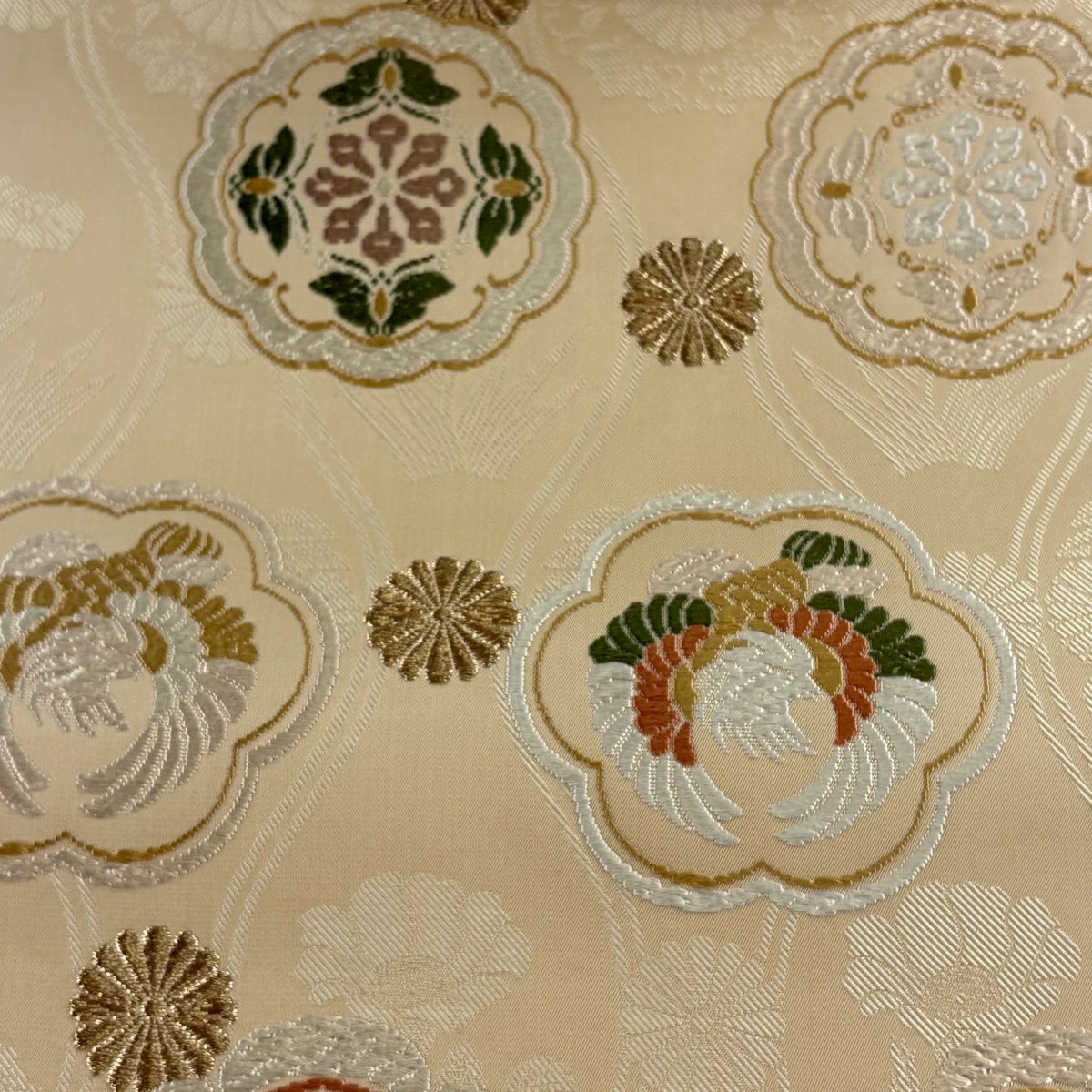 【在庫一掃】 袋帯 逸品 証紙あり 草花 花菱 唐織 クリーム 六通 正絹