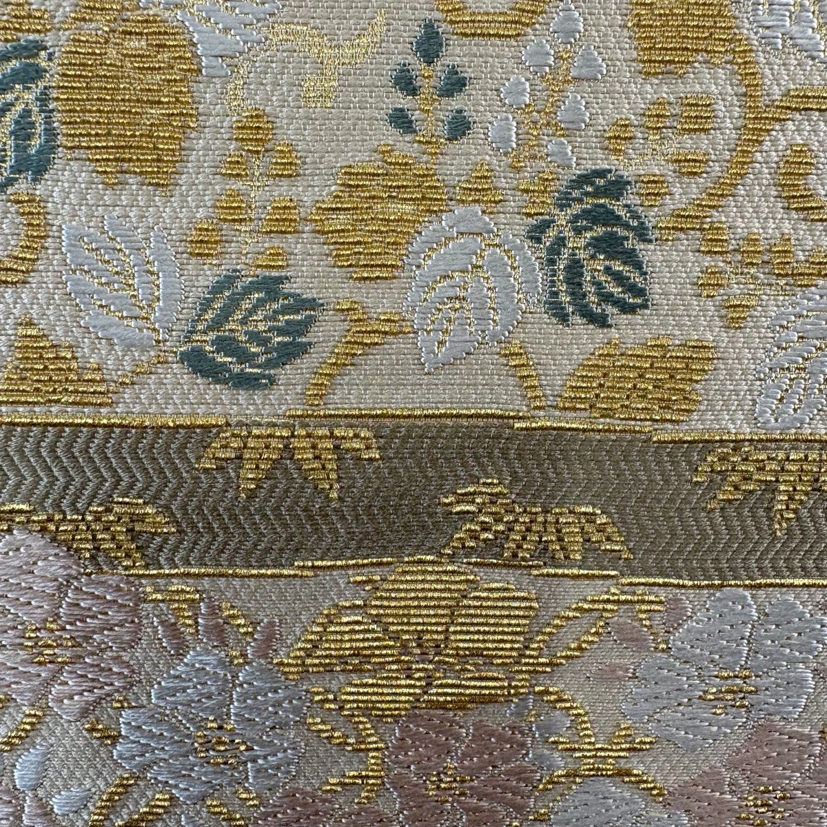 【美品】 袋帯 秀品 鳥 波 唐織 箔 ピンクベージュ 六通 正絹