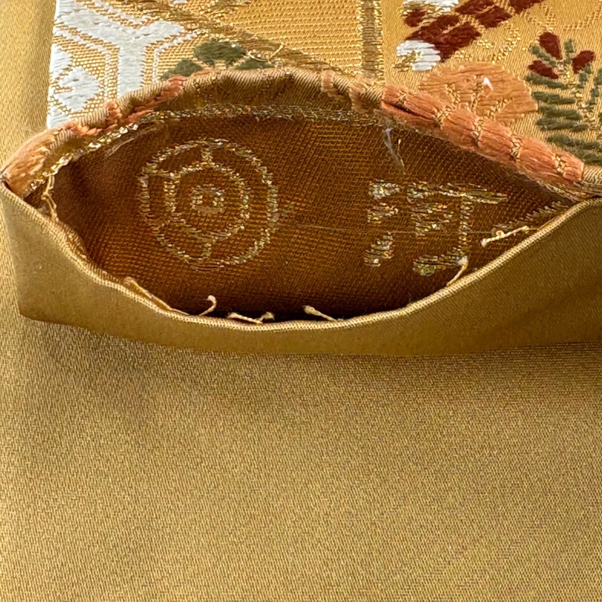 袋帯 逸品 河合美術織物 落款あり 毘沙門亀甲 草花 唐織 金糸 黄土色 六通 正絹