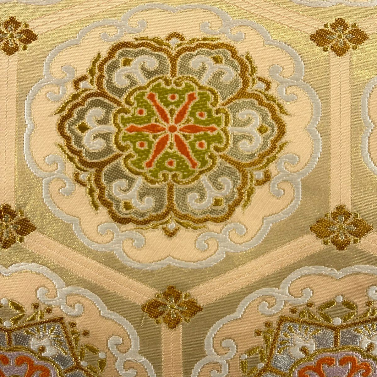 袋帯 名品 落款あり 本家加納 亀甲 華文 唐織 金銀糸 薄オレンジ 六通 正絹