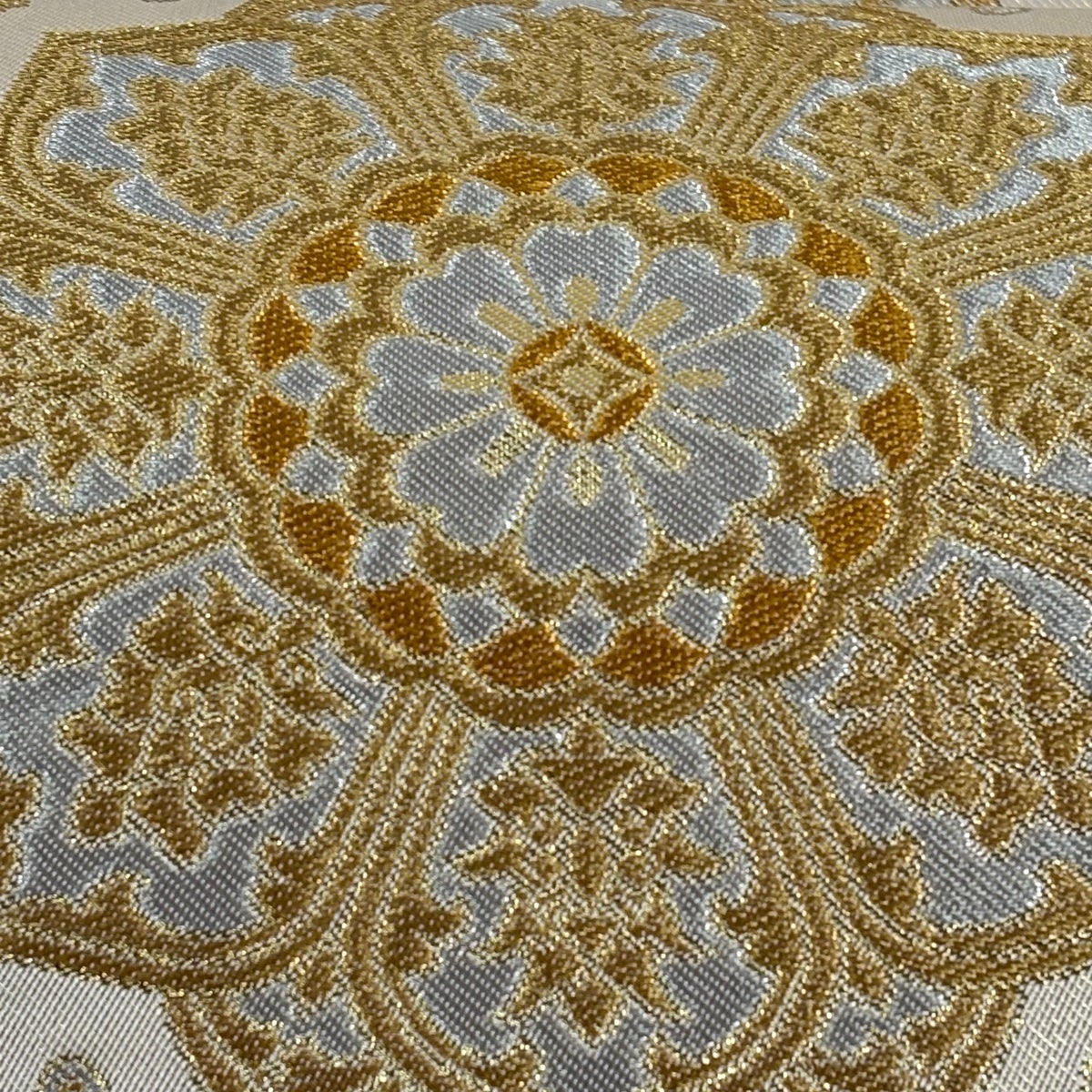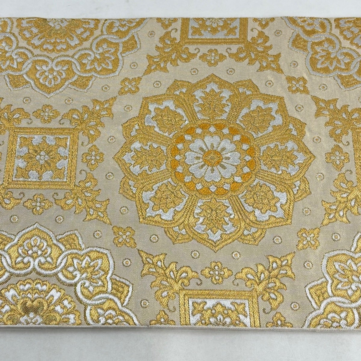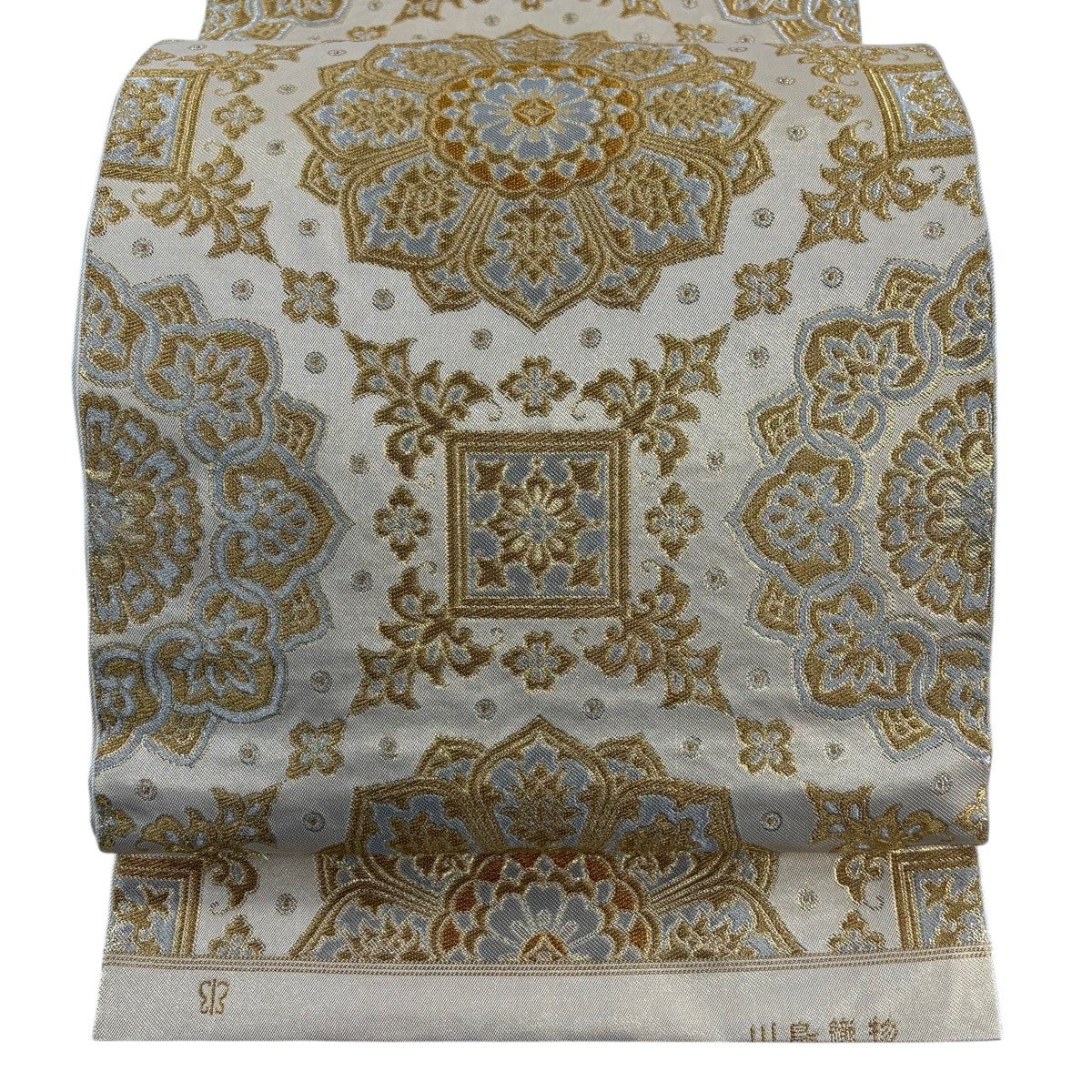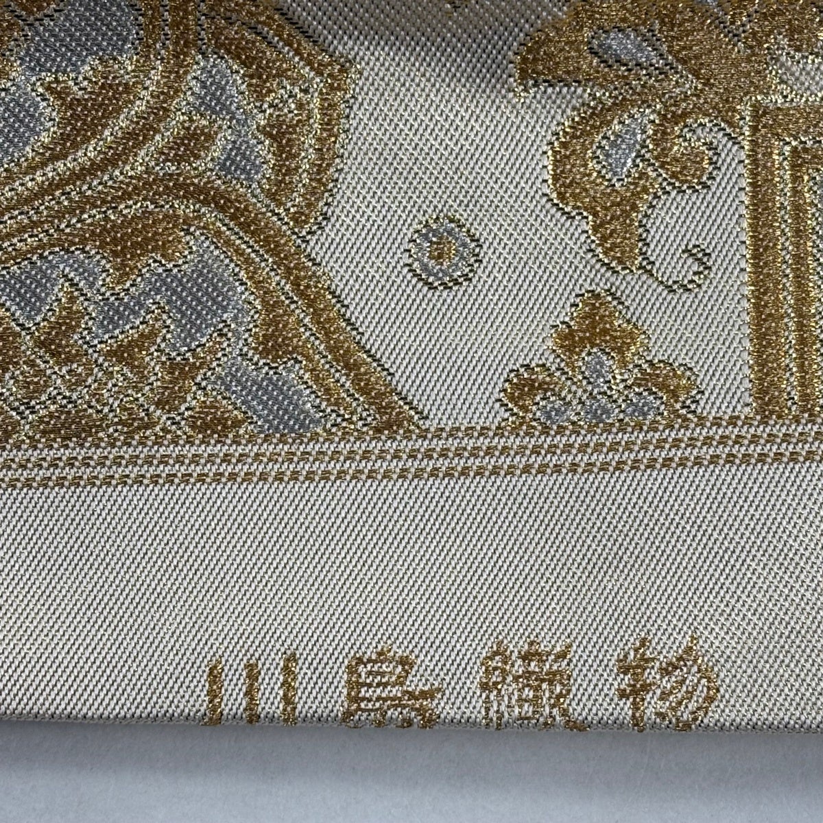 【在庫一掃】 袋帯 逸品 川島織物 落款あり 草花 七宝 唐織 箔 ベージュ 六通 正絹