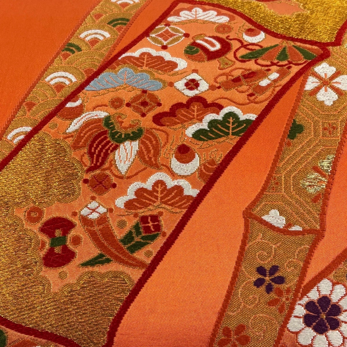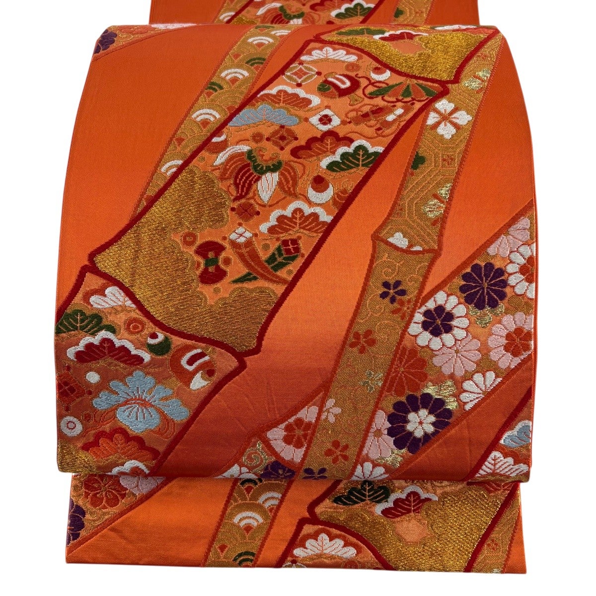 【在庫一掃】 袋帯 逸品 河合美術織物 落款あり 花丸文 籠目 唐織 箔 オレンジ 六通 正絹