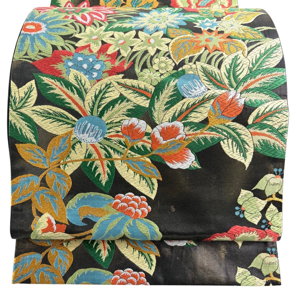 【美品】 袋帯 名品 落款あり 関西仕立て コシノヒロコ 波 枝花 唐織 箔 墨色 お太鼓柄 正絹