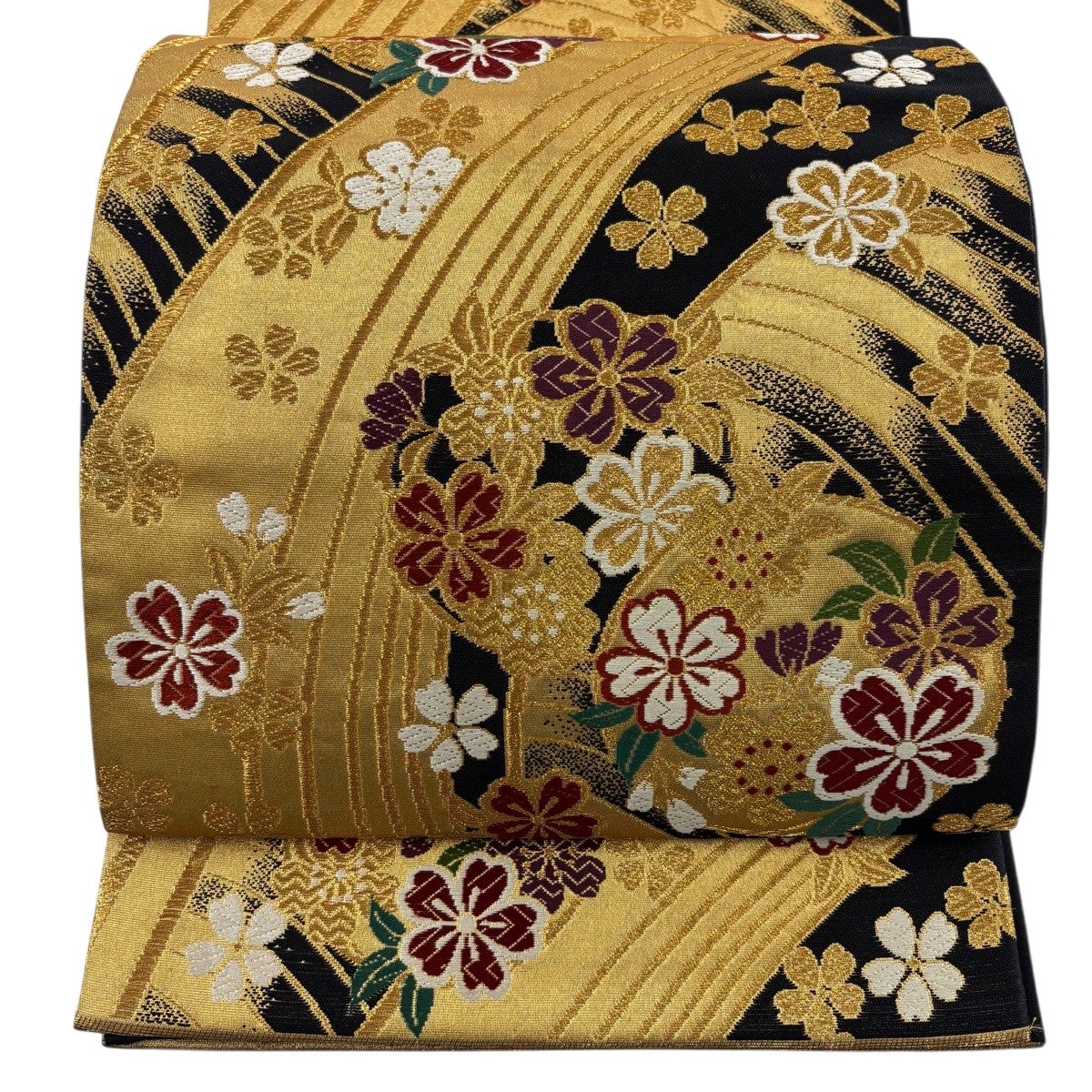 袋帯 秀品 桜 流水 金糸 唐織 青緑 六通 正絹