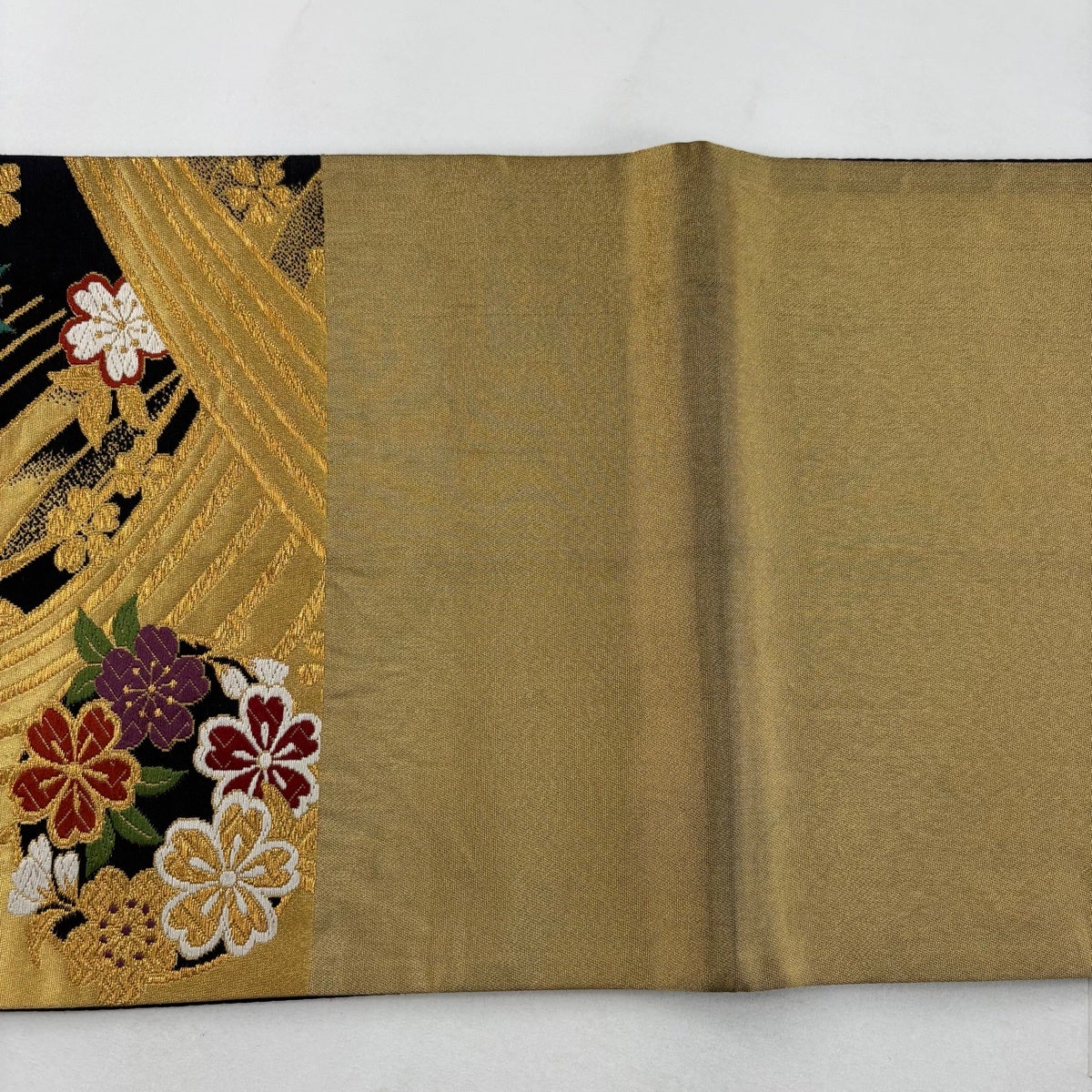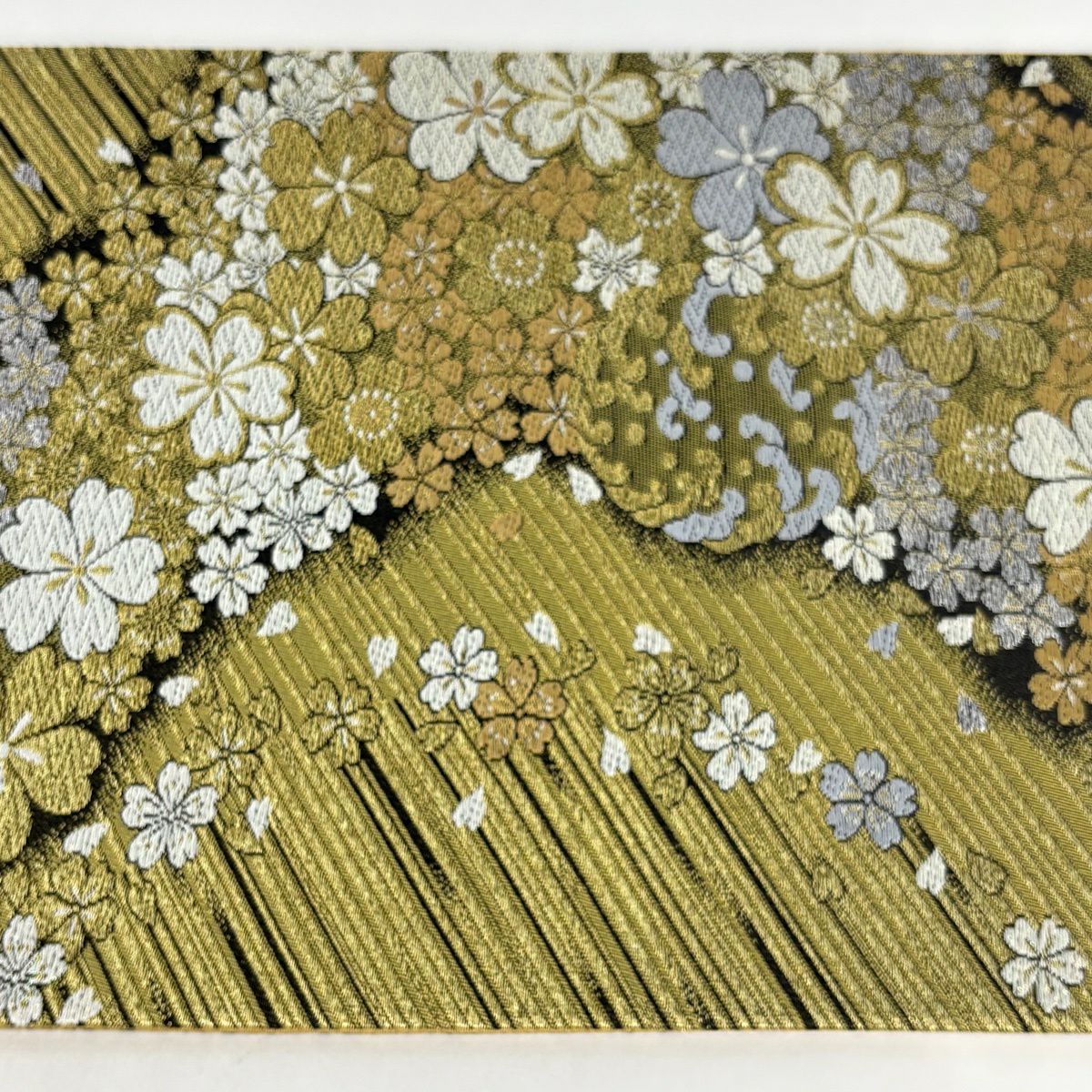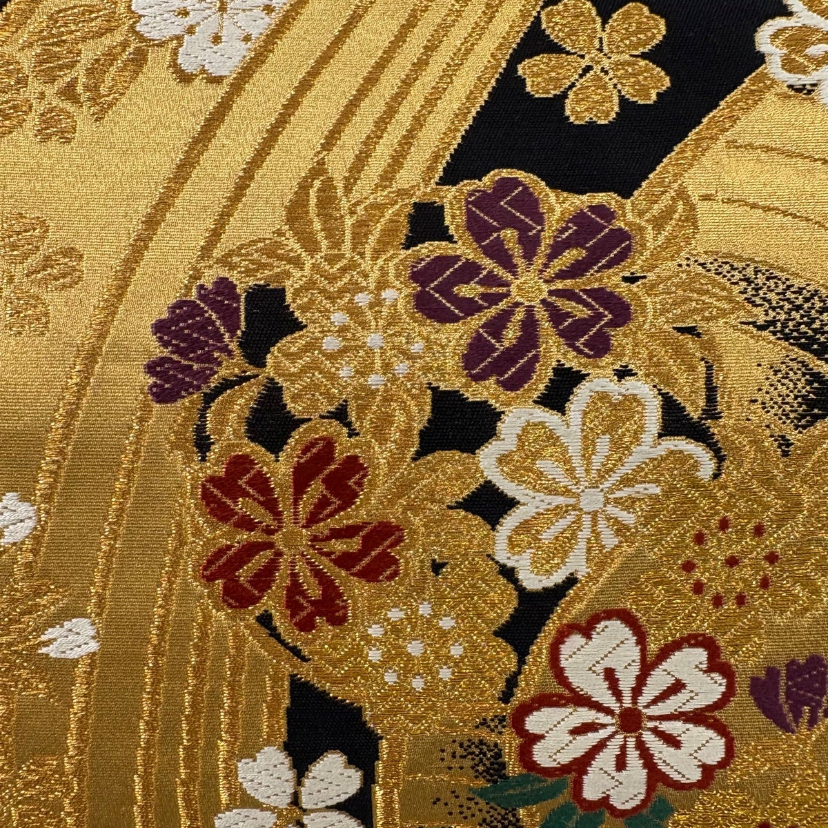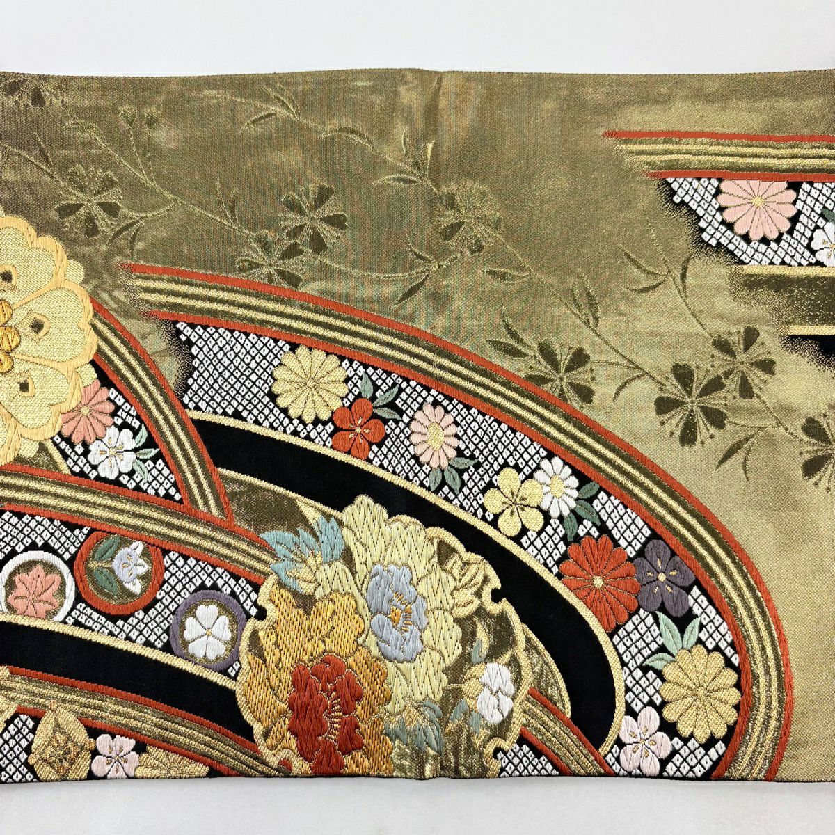 袋帯 秀品 扇面 草花 金糸 唐織 金色 六通 正絹