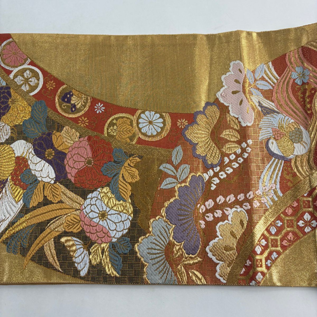 袋帯 秀品 団扇 草花 唐織 箔 金色 六通 正絹