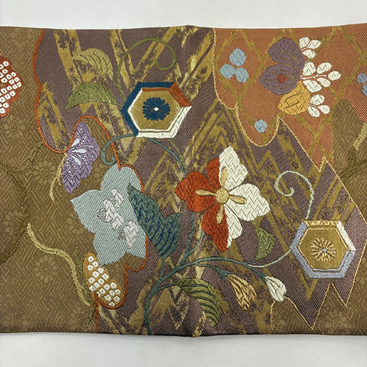 袋帯 秀品 菊 流水 唐織 箔 薄茶色 六通 正絹