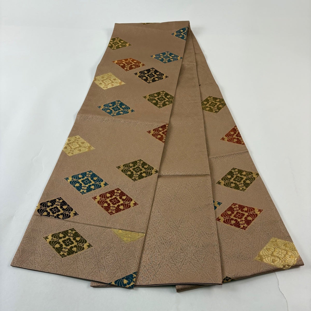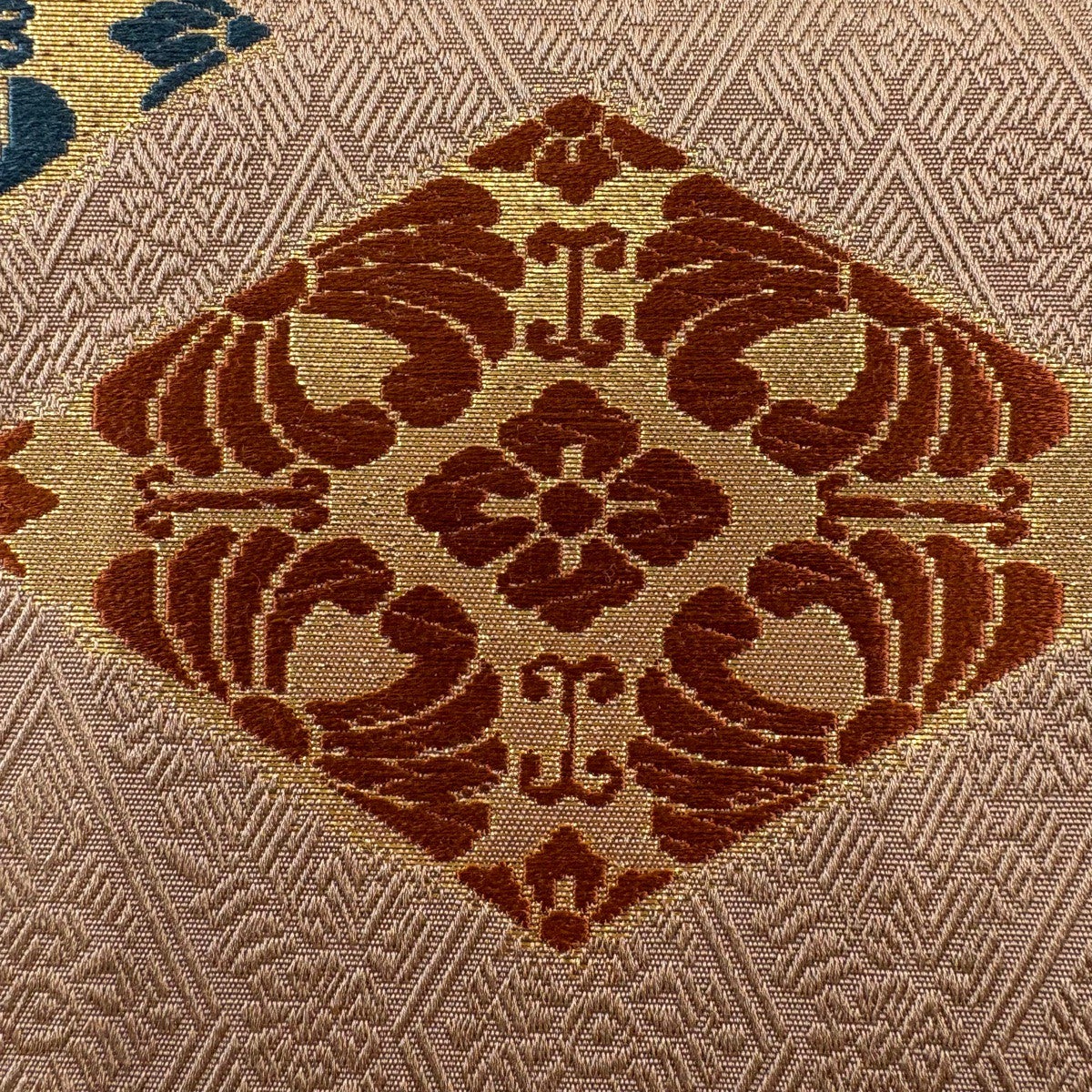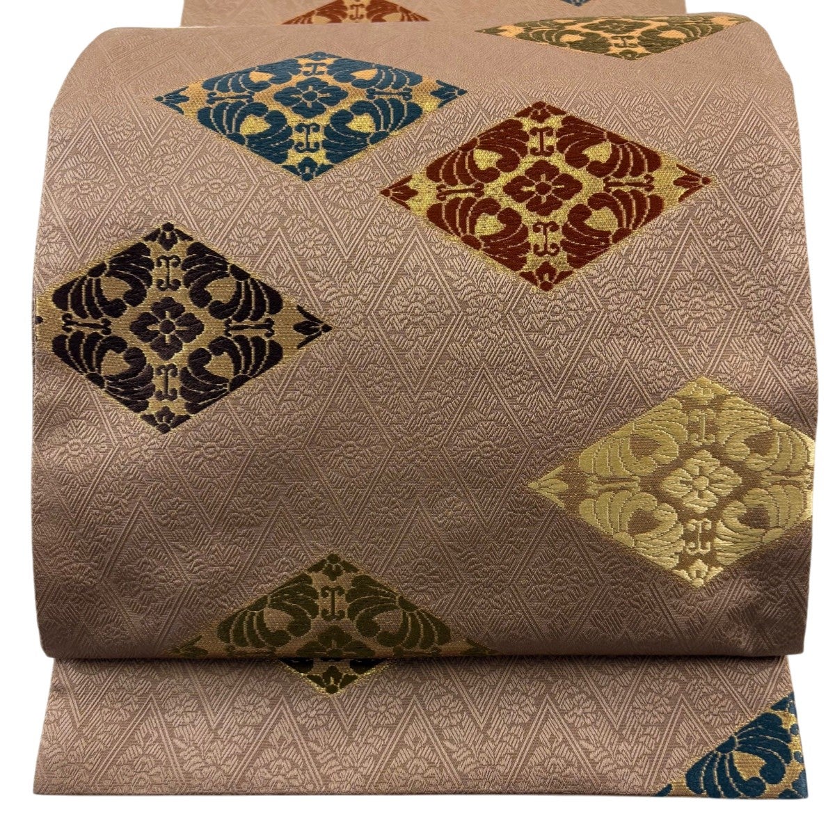 袋帯 秀品 草木染 菱文 花菱 箔 唐織 薄茶色 六通 正絹