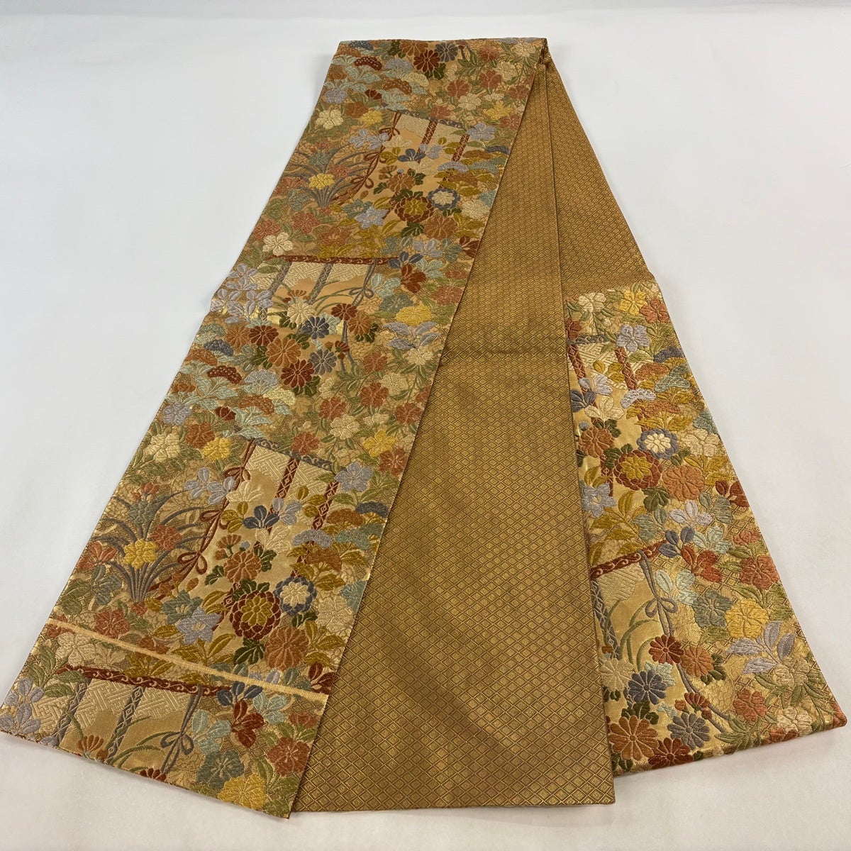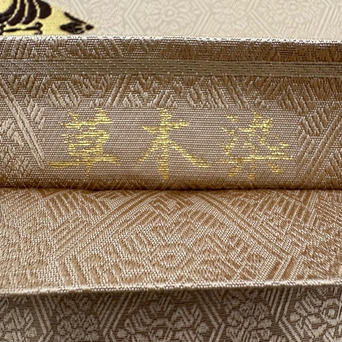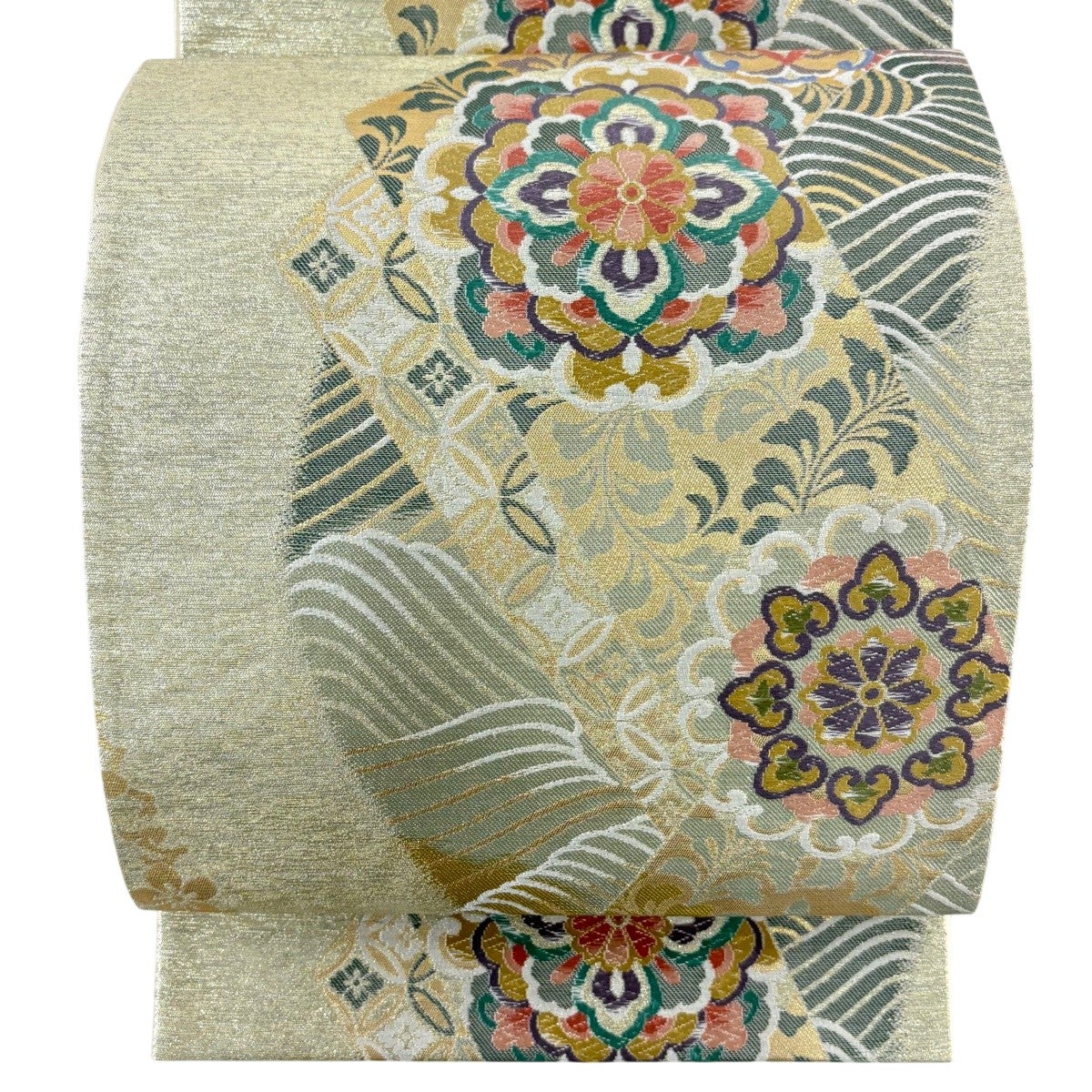 袋帯 秀品 秋草 観世水 唐織 箔 ベージュ 六通 正絹