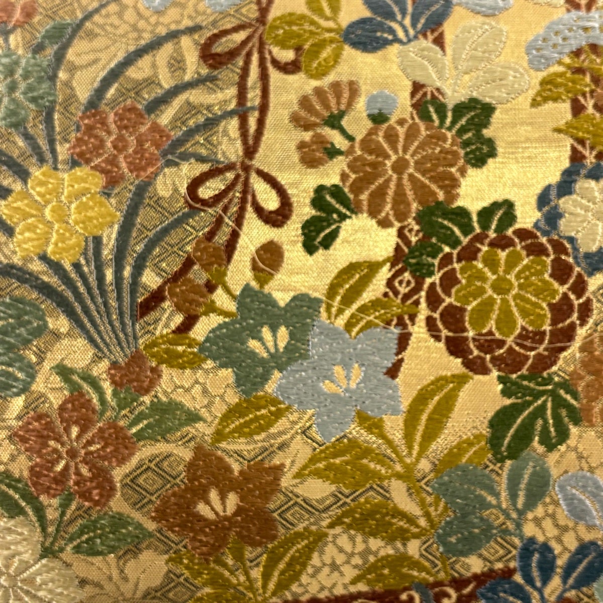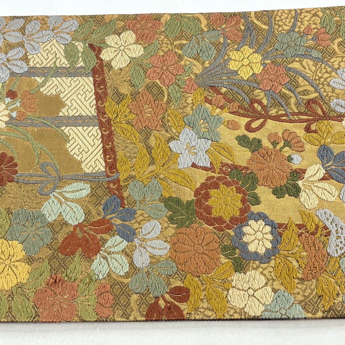 袋帯 秀品 振袖向き 手鞠 草花 金糸 唐織 金色 六通 正絹