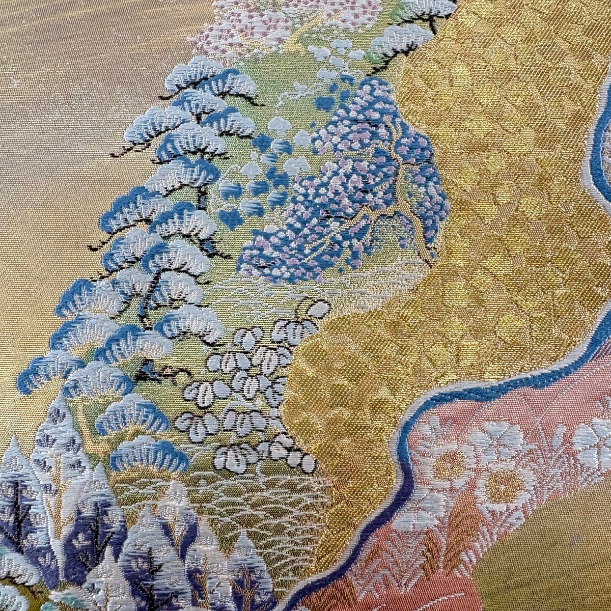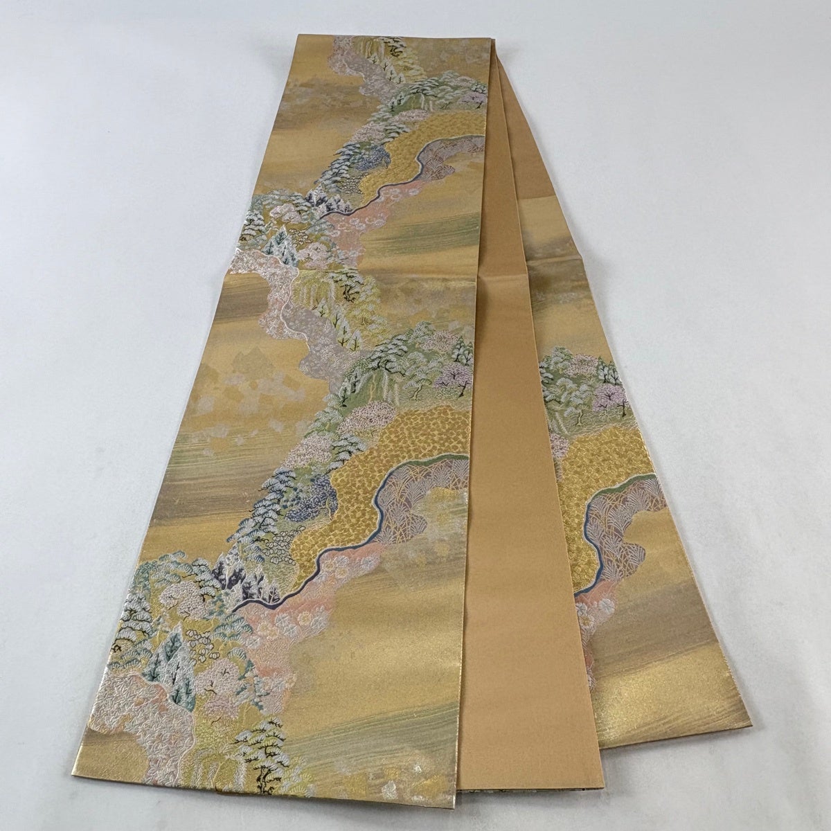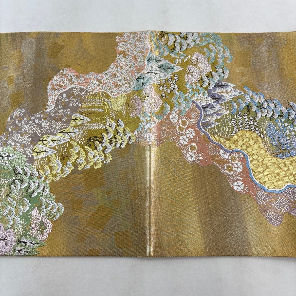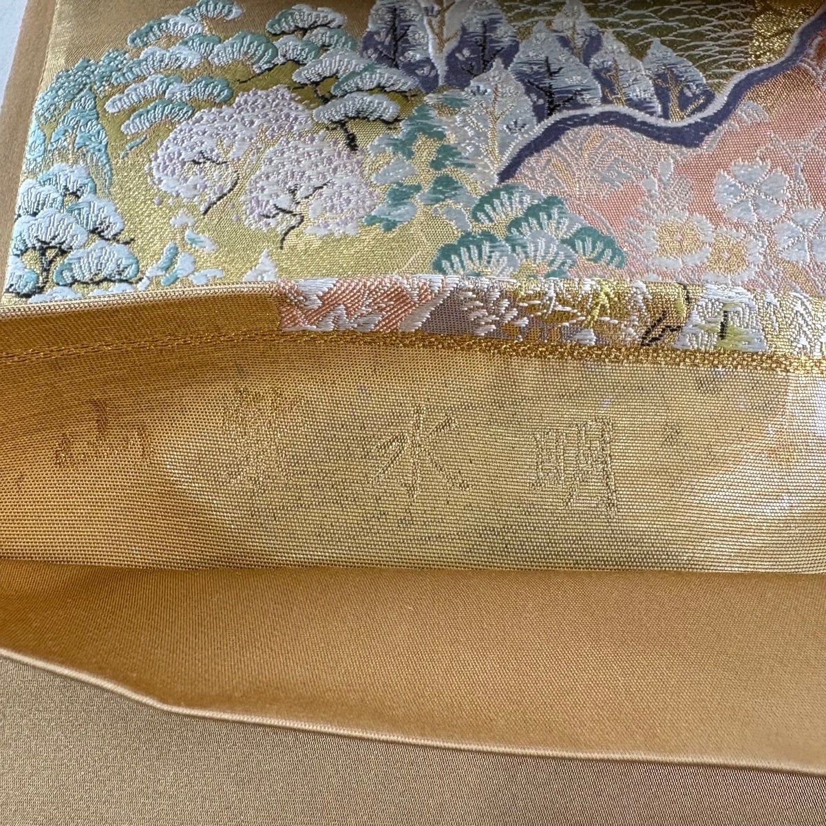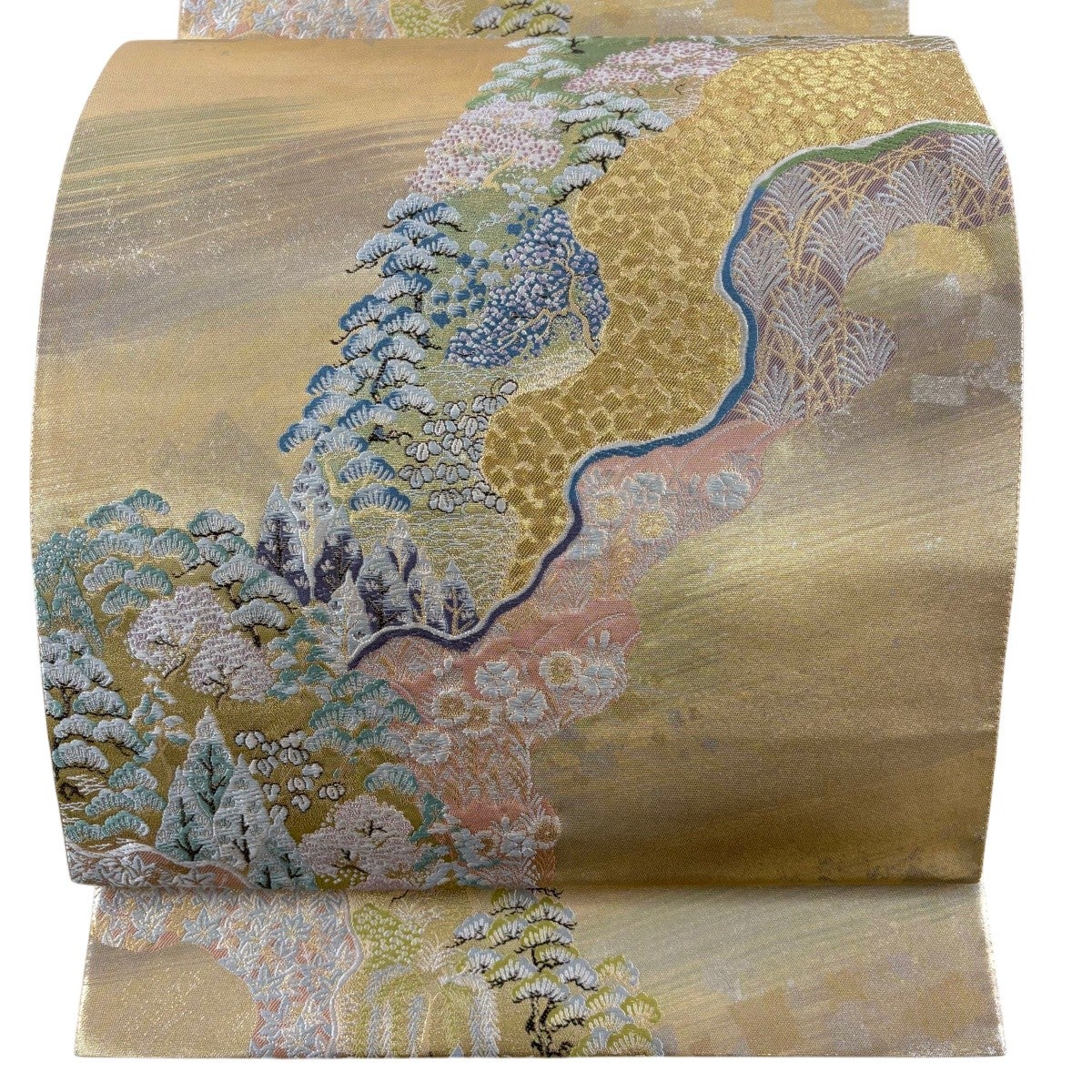 袋帯 秀品 山紫水明 樹木 笠松 唐織 箔 金色 六通 正絹