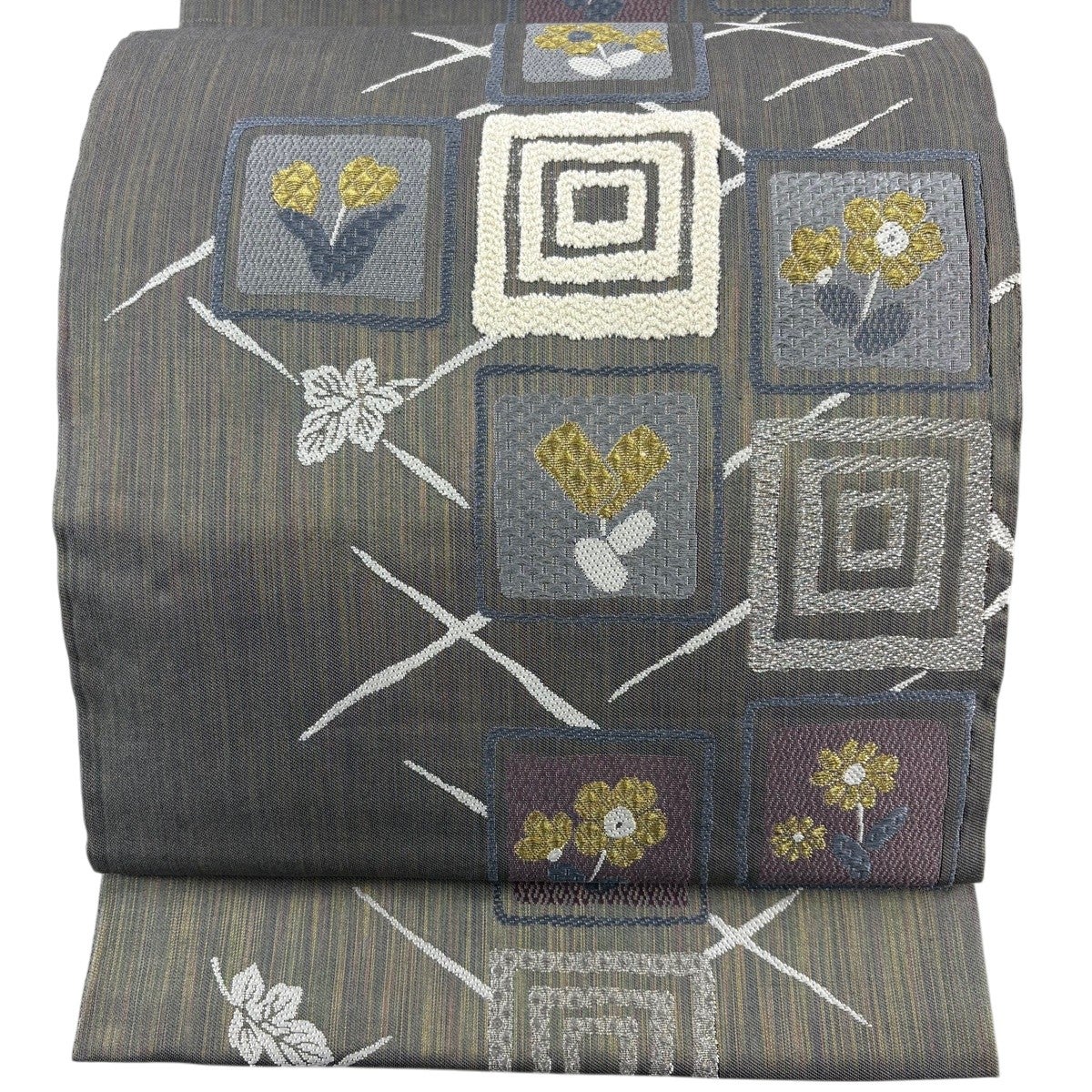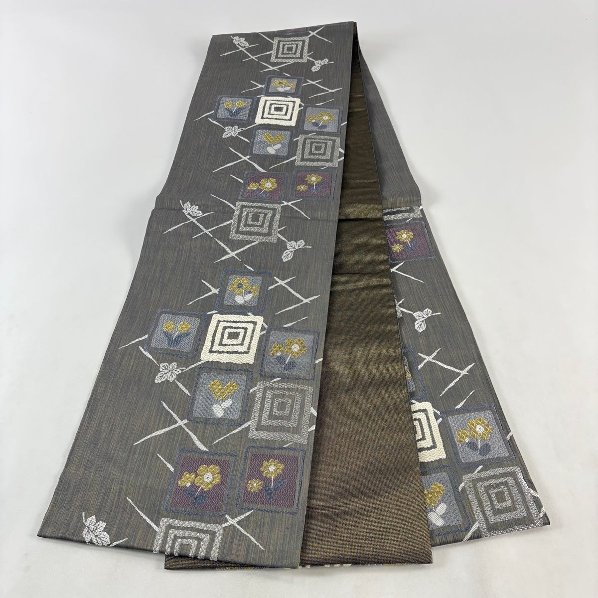 袋帯 秀品 草花 幾何学模様 金銀糸 唐織 灰色 六通 正絹