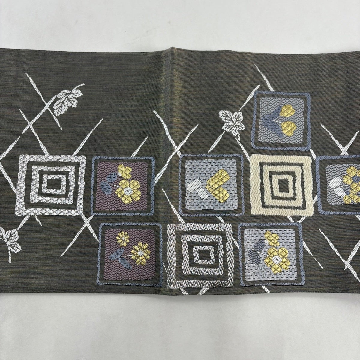 袋帯 秀品 草花 変わり市松 金糸 唐織 茶緑色 六通 正絹