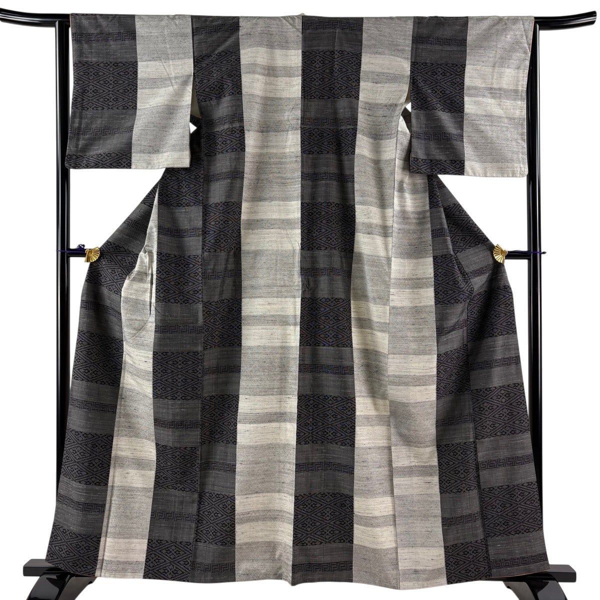 塩沢紬 身丈161cm 裄丈64cm M 袷 ゆきやま紬 証紙あり 菱 縞 灰色 正絹 名品