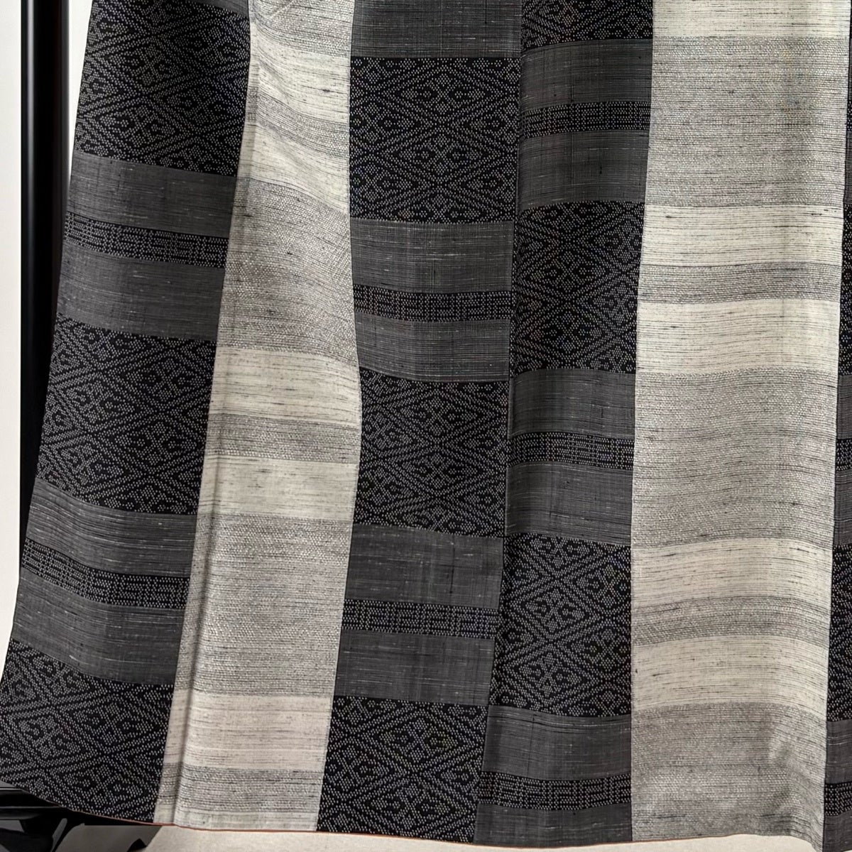 【美品】 塩沢紬 身丈156cm 裄丈66cm M 袷 塩沢物語 証紙あり 縦縞 幾何学模様 黒灰 正絹 名品
