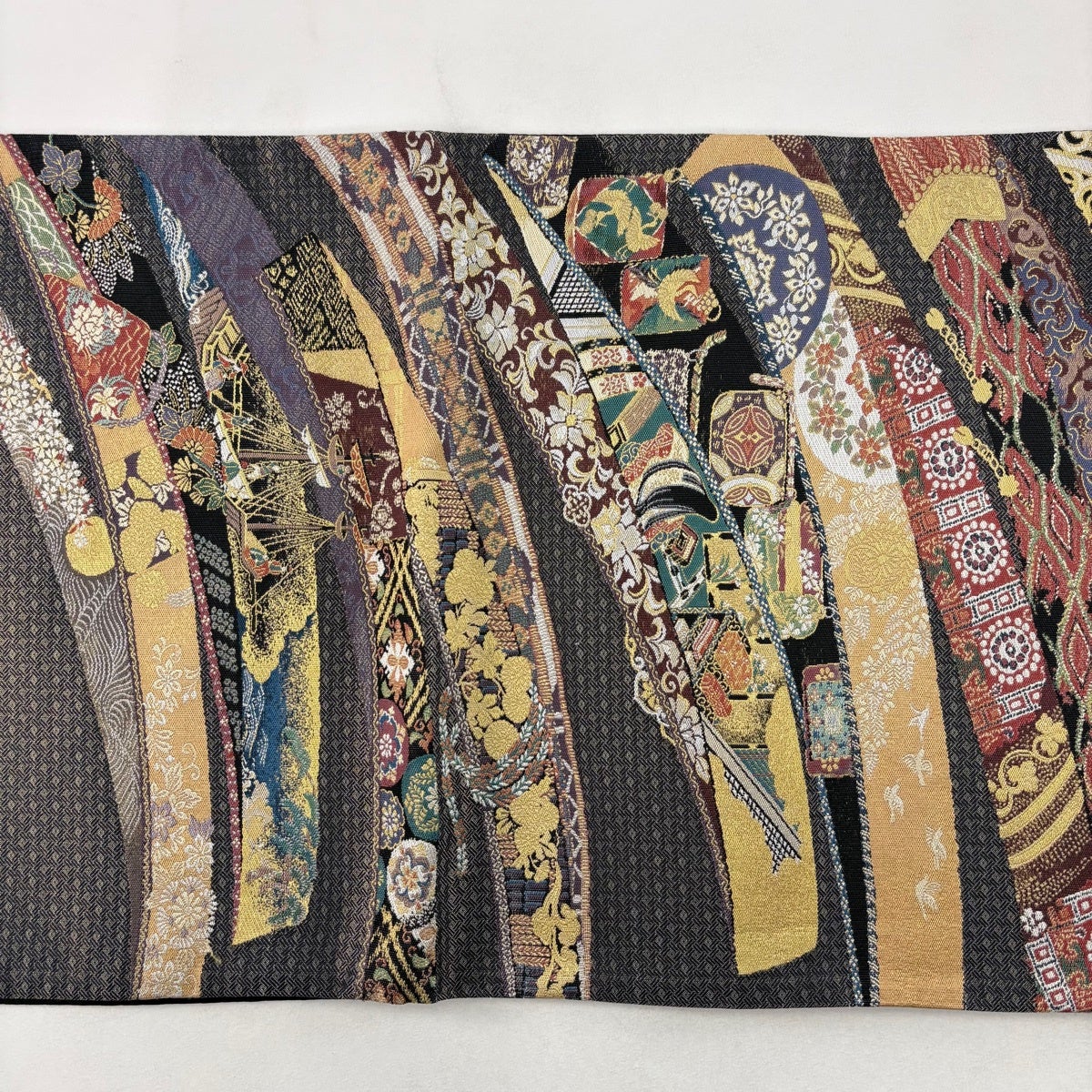 袋帯 秀品 草花 扇 箔 金糸 墨色 六通 正絹