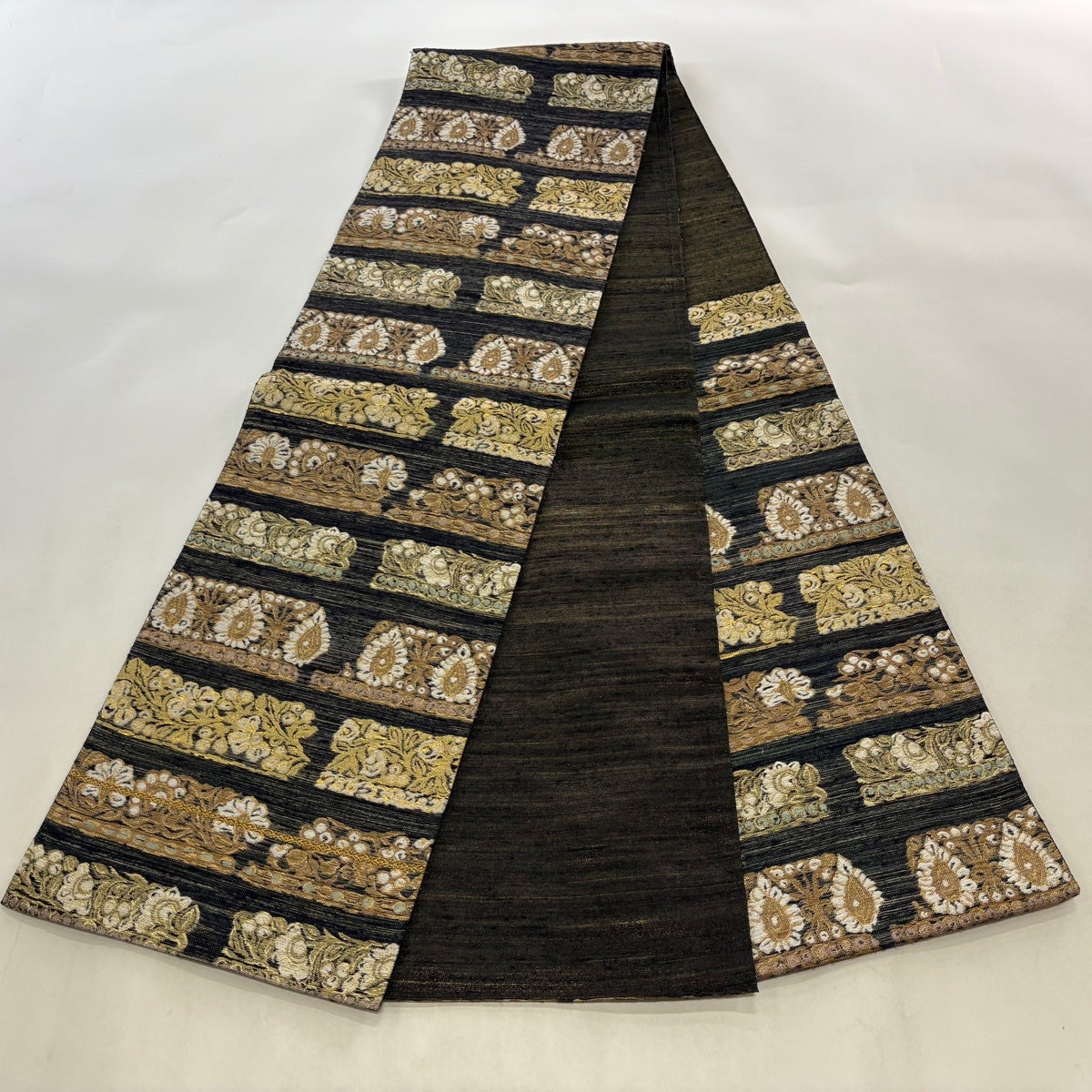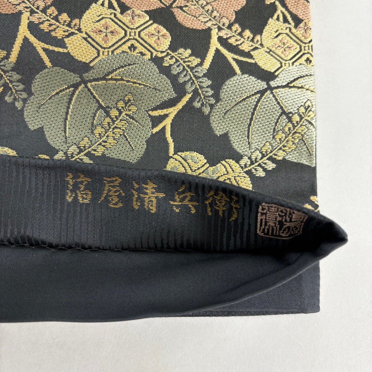 袋帯 秀品 鈴乃屋 斜縞 椿 金糸 刺繍 墨色 六通 正絹