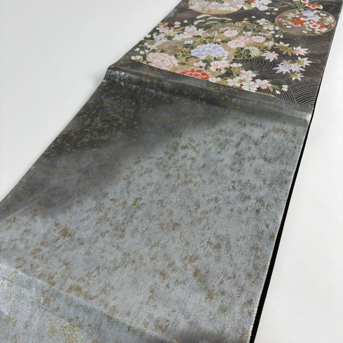 袋帯 秀品 夏帯 絽 菊 幾何学 銀糸 箔 墨色 六通 正絹