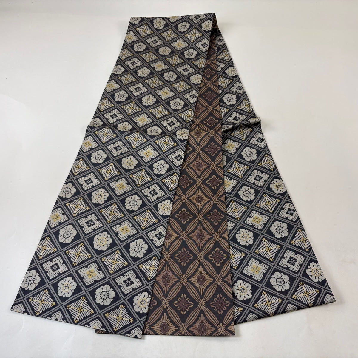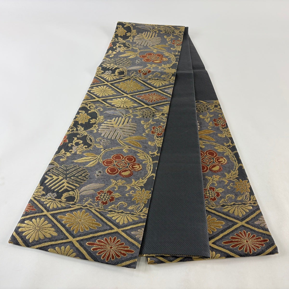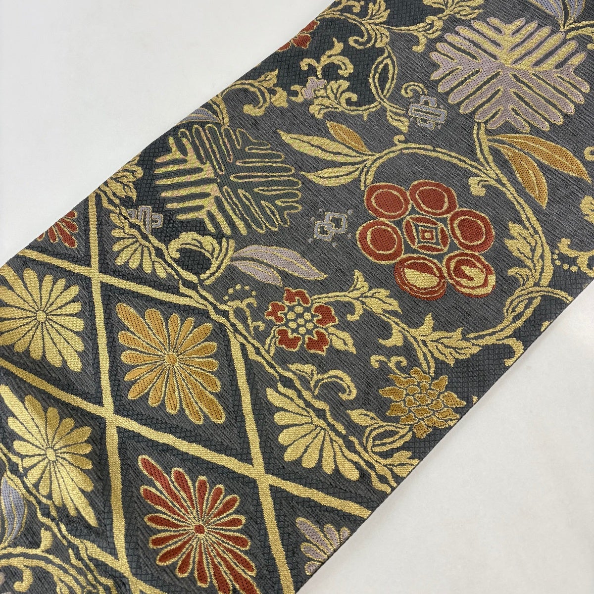 袋帯 秀品 関西仕立て 幾何学模様 菱 箔 墨色 六通 正絹