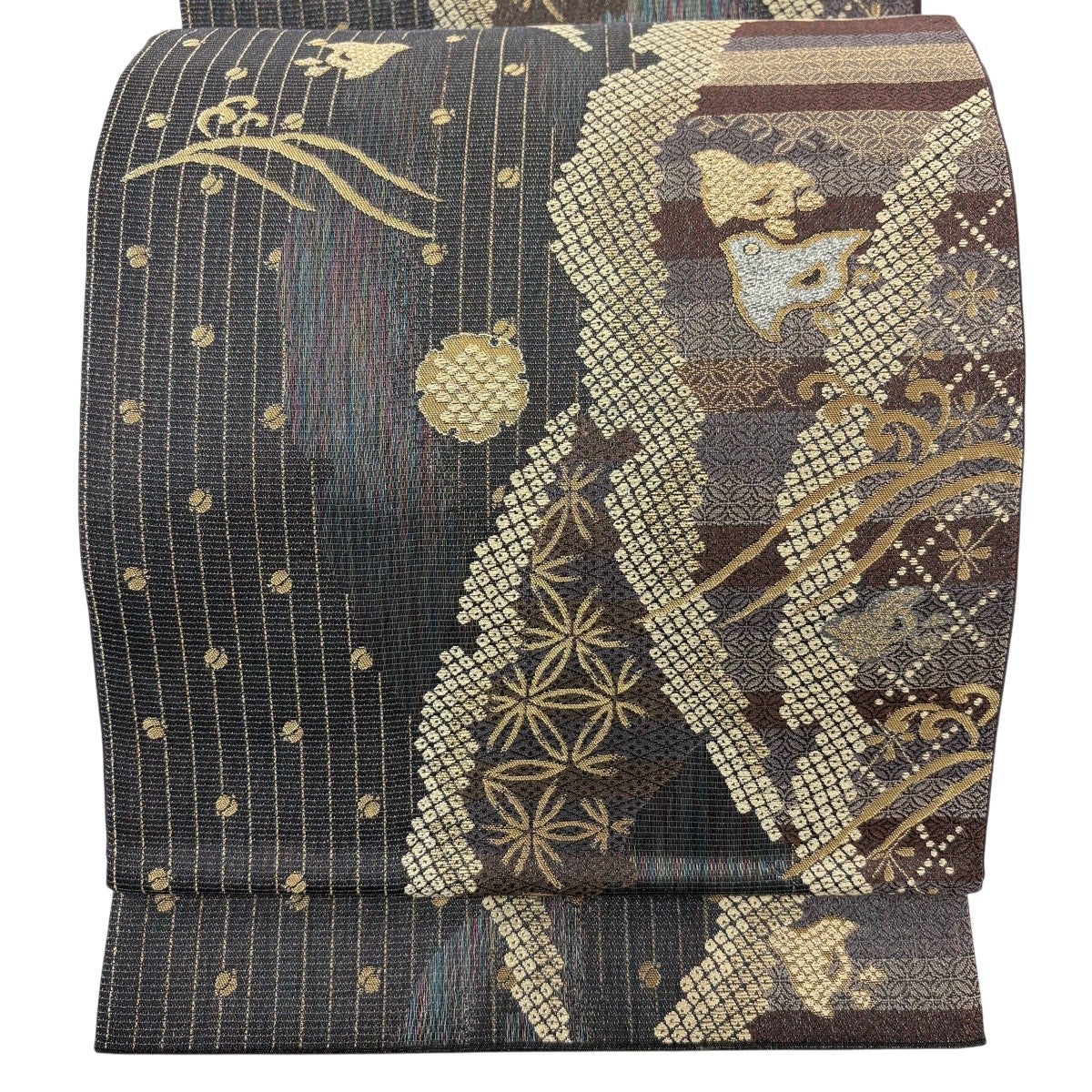 袋帯 名品 夏帯 扇面 花鳥 金糸 銀糸 墨色 六通 正絹