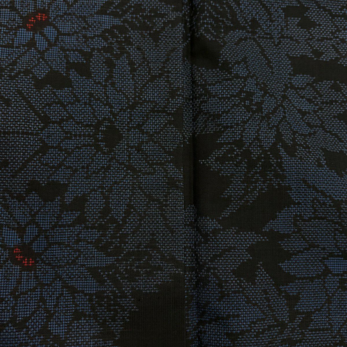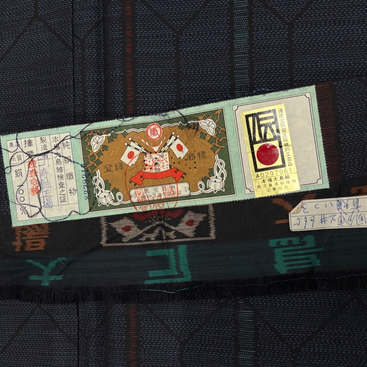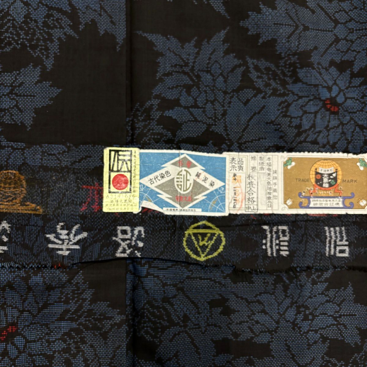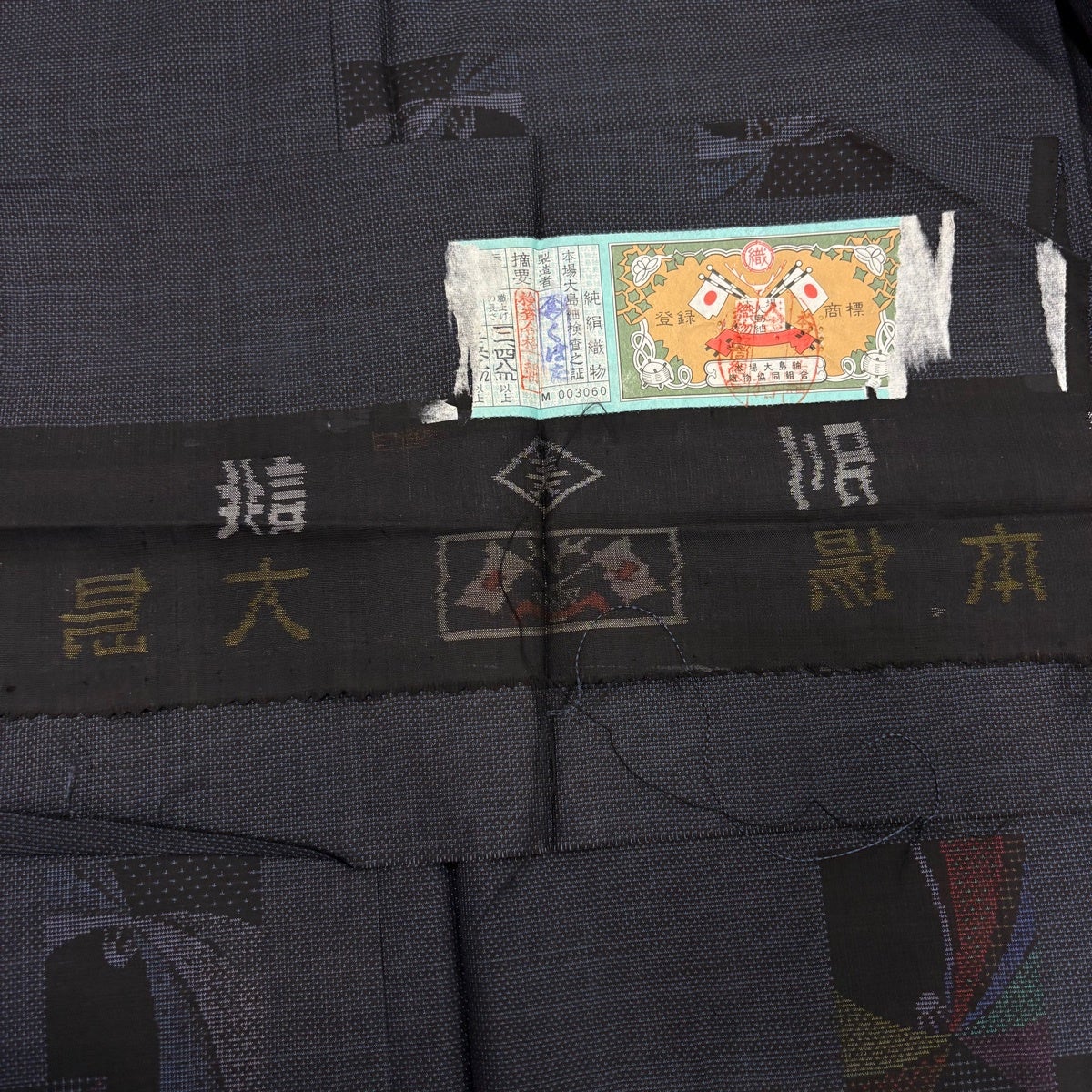 大島紬 身丈158.5cm 裄丈63.5cm S 袷 証紙あり 花 幾何学模様 紺色 正絹 秀品